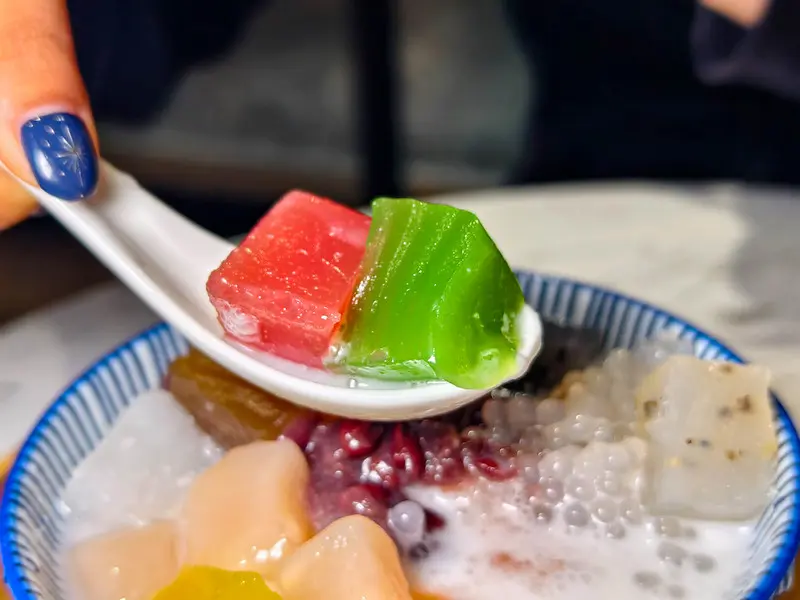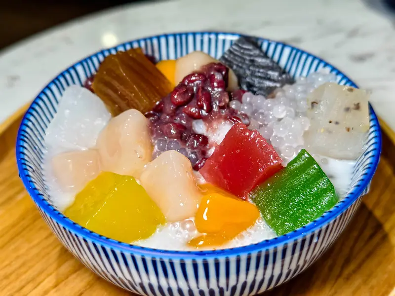 初次造訪強烈推薦點上一碗招牌的「七彩粉粿西米露三號」,一端上桌,紅、黃、綠、灰交織的粉粿配上白雪般的湯底,視覺效果非常夢幻好拍。在湯底的選擇上,絕對要搭配店家特製的濃郁「椰奶」。當繽紛的粉粿與配料浸泡在雪白的椰奶中,整碗甜品瞬間升級成道地的南洋風味。那股醇厚迷人的奶香非常搶戲卻不膩口,完美地將所有配料融合在一起。每一口都能品嚐到椰奶的滑順與食材的香氣,讓整體的味覺層次變得更加豐富圓滿,令人回味無窮。