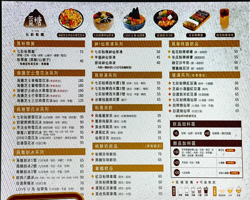 這裡的菜單設計雖然看似品項眾多,但其實邏輯非常簡單明瞭。整間店的核心靈魂就是那超吸睛的「七彩粉粿」,客人可以自由選擇搭配傳統黑糖刨冰、綿密雪花冰或是濃郁的西米露湯底。店家特別標榜粉粿的繽紛色彩絕非使用人工色素,而是以梔子花、紅麴、抹茶、芝麻等天然食材進行染色,吃得安心又健康。實際品嚐會發現,這款七彩粉粿有別於古早味那種軟爛黏牙的質地,而是切成好入口的小方塊狀,咬下去阻力較大,呈現出極具Q彈與嚼勁的紮實口感。