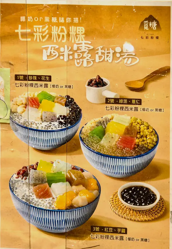 位在台北中山區興安街美食戰區的「覓糖Mi Tang」,是一間顛覆傳統印象的文青風冰品甜點店。這裡最大的亮點就是視覺效果極佳的「七彩粉粿」,有別於傳統市場裡黃色軟爛的口感,店家堅持使用天然食材如紅麴、抹茶與梔子花來染色,不僅色彩繽紛吸睛,口感更是Q彈有嚼勁。店內環境明亮乾淨,提供冷氣開放的舒適空間,非常適合在興安街吃完正餐後,來這裡坐坐解個饞。特別推薦加上濃郁椰奶的西米露系列,豐富的配料絕對能讓喜愛咀嚼的饕客大呼過癮。