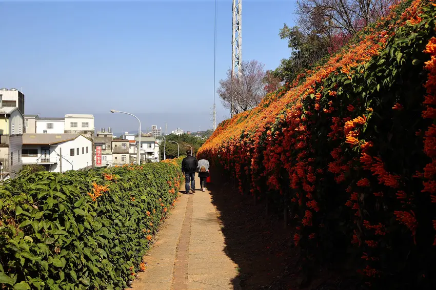 炮仗花隧道,就在路邊的銅鑼環保公園,此處是長條形公園綠帶,設有涼亭、觀景台,可以眺望後龍溪溪谷與遠方的客屬大橋