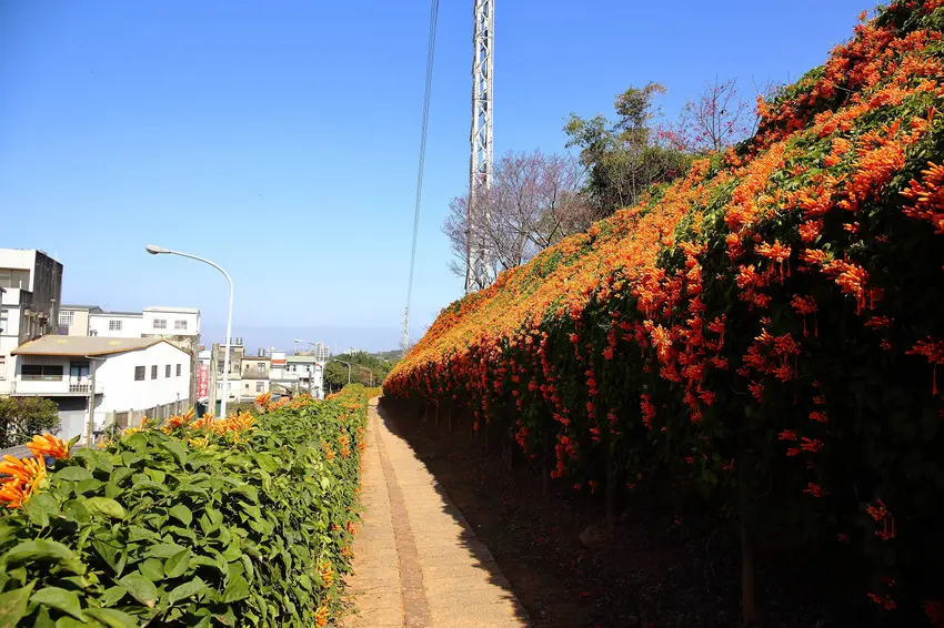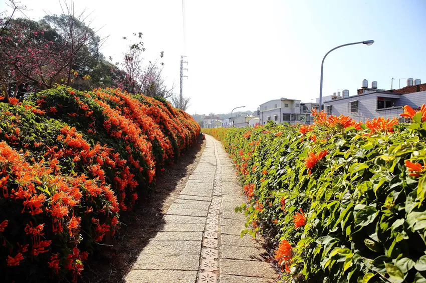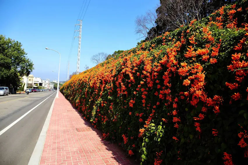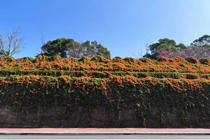 下層與中層(炮仗花瀑):兩層並排的垂墜式炮仗花牆,形成綿延的花瀑布隧道,非常適合拍照