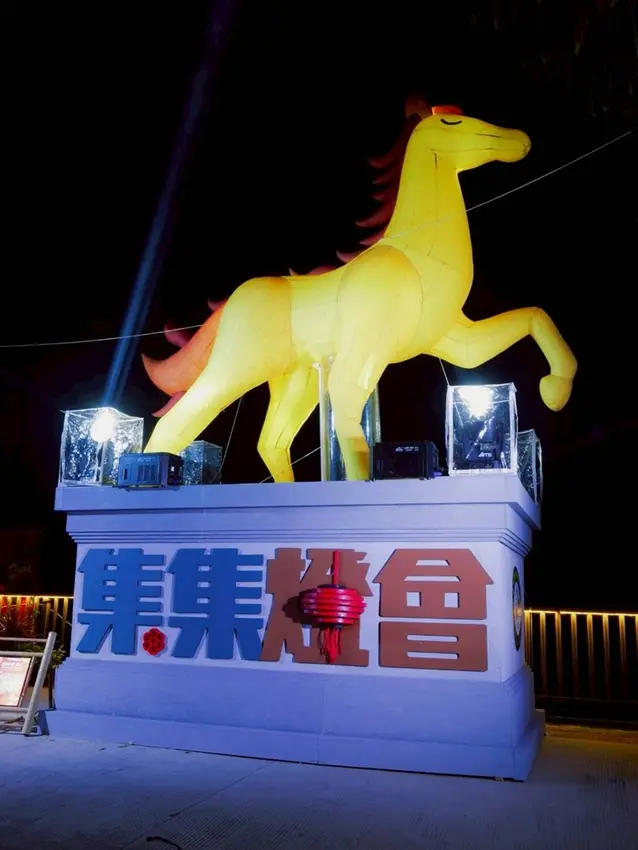 走到集集民權路前,視線真的會被這座主燈牢牢吸住。高達7米的金馬主燈,在夜色中閃耀發光,整體線條流暢俐落,馬身昂首前行的姿態充滿力量感,象徵奔騰向前、勇往直前的精神。燈光隨著節奏變化,從溫暖金黃到層次光影交錯,氣勢十足卻不失細膩。
