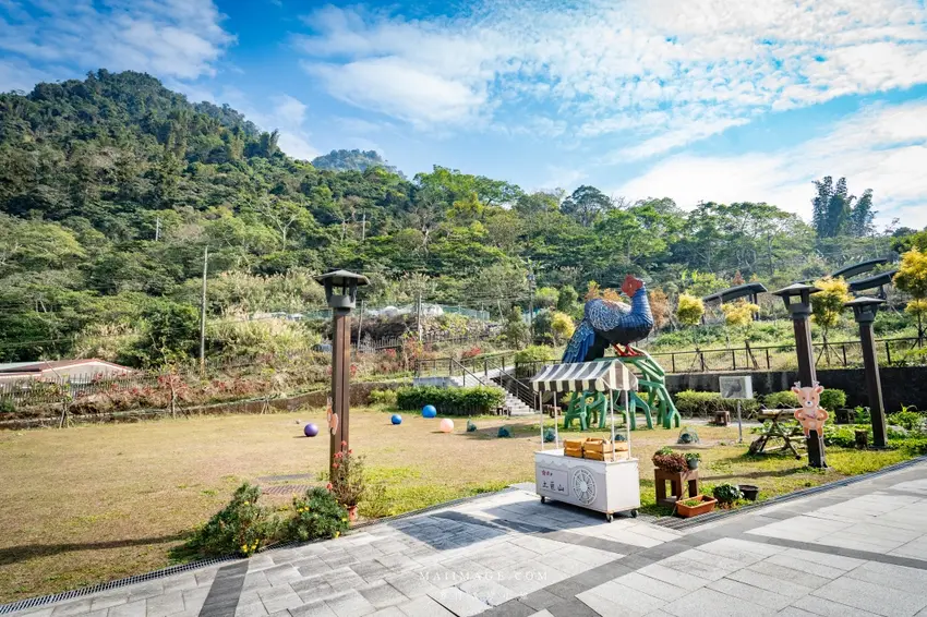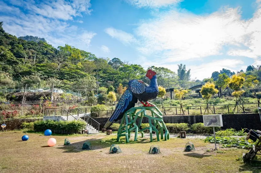 沿著台18線行駛至阿里山公路47.4K處,便會抵達「公興森態園區」(原阿里山土匪森活村)。園區入園僅需五十元清潔費,且可全額折抵內部消費。園區內設有巨型的「藍腹鷴」地景藝術與小火車造景,非常適合拍照打卡;同時這裡也是寵物友善空間,擁有寬廣草地供毛小孩活動。園內的「龍美步道」總長約八百多公尺,穿梭在茂密的杉木林中,坡度平緩,約半小時即可走完,適合親子同遊。逛累了還能用門票折抵清涼的山粉圓愛玉,享受山林微風。