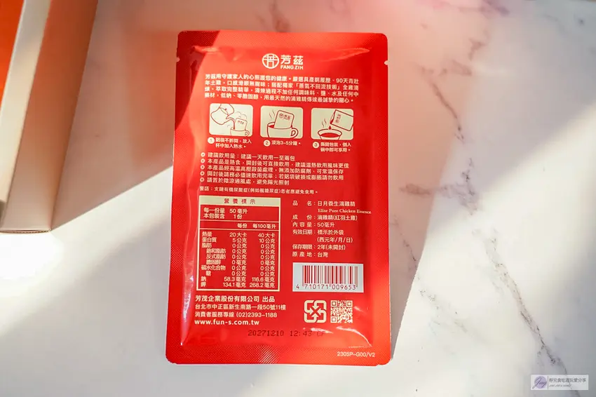 在產品包裝的細節上,芳茲展現了極高的嚴謹度與便利性。所有的滴雞精與滴魚精皆採用鋁箔袋獨立包裝,經過專業的高溫高壓滅菌處理,因此能夠在常溫下穩定保存,完全不需要佔用冰箱空間。這樣的設計不僅在運送過程中無需擔心變質問題,對於經常需要出差或外宿的族群來說更是極大的福音。無論是直接丟進行李箱,或是平時趕著上班隨手塞進包包,都不受空間與冷鏈設備的限制。此外,每一包產品的包裝上皆清楚標示了成分、食用方式以及有效日期,讓消費者在隨時隨地撕開補充元氣時,都能感到無比的安心與便利。