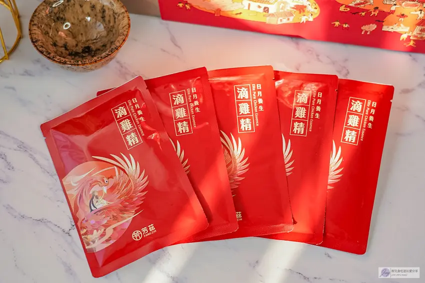 廣受好評的「日月養生滴雞精」,在原料的選擇上極為嚴苛。芳茲嚴選飼養九十天以上、擁有健康證明的優質紅羽土雞,且飼養過程中堅持不打針、不用藥。最關鍵的製程在於採用全雞新鮮滴煉,過程中完全不添加任何一滴水,並透過獨家的蒸氣不回流技術,讓食材與水蒸氣徹底分離,完美鎖住最純粹、完整的營養精華。倒出來的滴雞精呈現漂亮的深茶褐色,伴隨著極其濃郁的香氣,口感厚實且帶有滿滿的膠質感卻完全不黏膩。產品做到低鈉、零膽固醇、零脂肪,並榮獲多項國內外殊榮與衛福部建字號健康食品認證,品質極高。