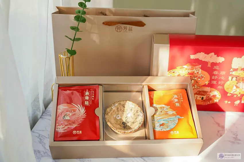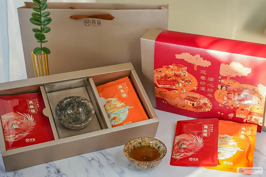 送禮首選「芳茲生技」雞魚饗宴新春禮盒。內含高純度滴雞精與清甜無腥味滴魚精,常溫保存攜帶方便,是全家日常保養的頂級補給。