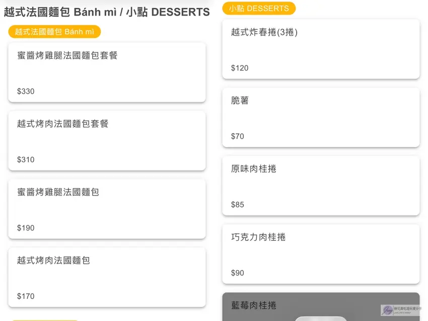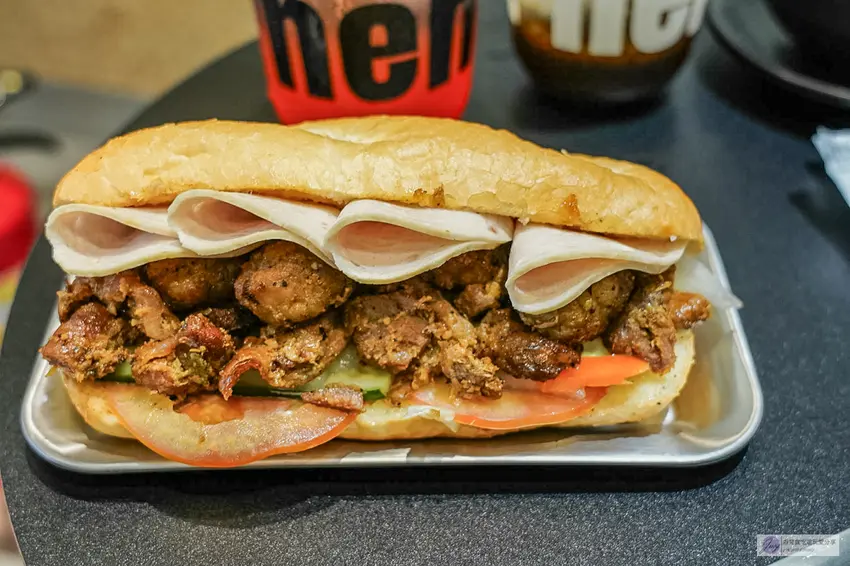 首推必點的「蜜醬烤雞腿法國麵包」,外層麵包烤得極致酥脆,內餡夾入火腿、番茄片、小黃瓜與生菜,搭配處理得軟嫩不乾柴的蜜醬烤雞腿,甜鹹適中的調味與驚人的大份量,帶來極高的飽足感。「越式烤肉法國麵包」則展現了較為紮實的肉質口感,鹹香夠味的調味同樣令人回味無窮。此外,推薦加點一份外皮炸至金黃酥脆的「越式炸春捲」,飽滿的內餡誠意十足,沾上店家特製的酸甜沾醬一同入口,不僅完美平衡了炸物的油膩感,更讓整體風味顯得清爽解膩。