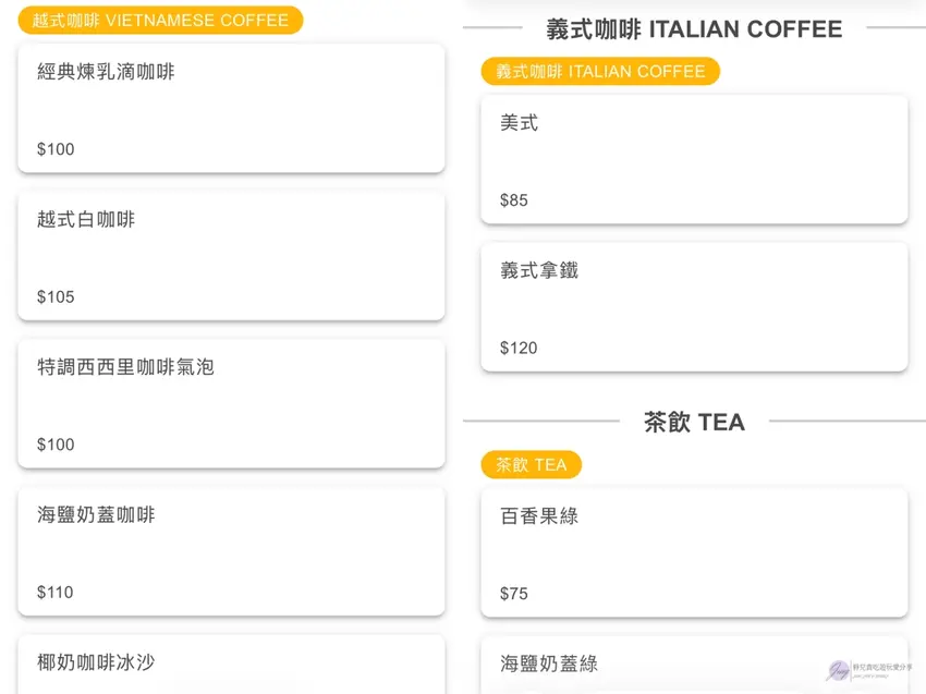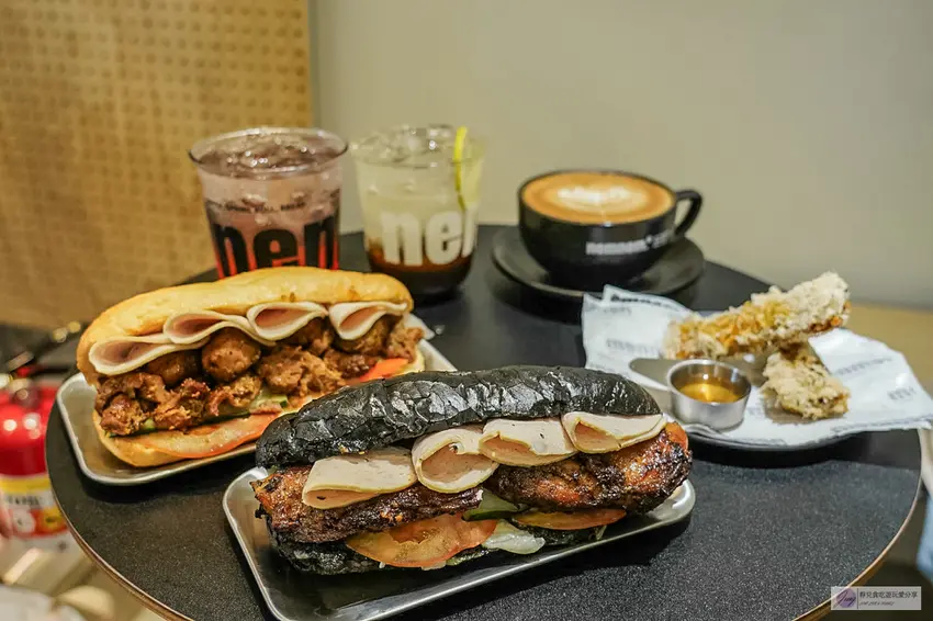 店內提供的餐飲品項相當豐富多元,從招牌的越式法國麵包、越式咖啡,到經典的義式咖啡、清爽茶飲與冰沙皆一應俱全。如果想要品嚐些許甜食,菜單上亦有提供誘人的肉桂捲可供選擇。其中最引人注目的,便是極具特色的越式法國麵包。顧客不僅可以選擇經典的原味麵包體,還能以銅板價加購升級為視覺效果十足的竹炭麵包,完美呼應了店內的黑白極簡主題。無論是想要來份飽足感滿分的異國輕食,或是單純想找個靜謐角落享受午後時光,這裡的餐點設計都能滿足各種需求。