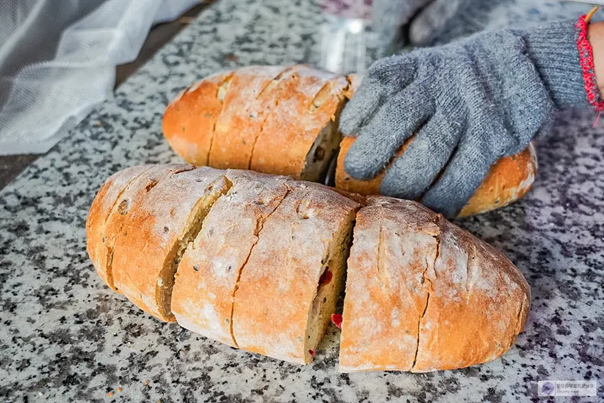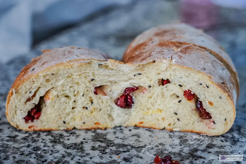 這裡的每一顆窯烤麵包皆重達500公克,拿在手上沉甸甸的份量感十足。招牌的蔓越莓麵包嚴選優質橄欖油製作,並採用天然酵母菌進行低溫長時間發酵,製程無添加任何防腐劑。剛出爐的麵包外皮帶有柴燒特有的微酥口感與淡雅燻香,內裡則保持著極佳的濕潤度與Q彈嚼勁,用料更是毫不手軟。在保存方面,常溫狀態下約可放置兩天,若未食用完畢,建議切片後放入冷凍庫保存,待想品嚐時再以烤箱稍微回烤,即可完美還原絕佳風味。