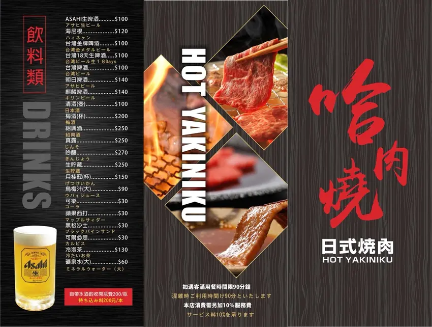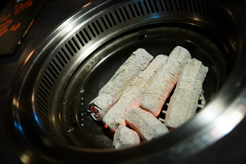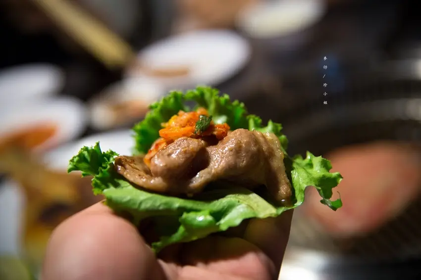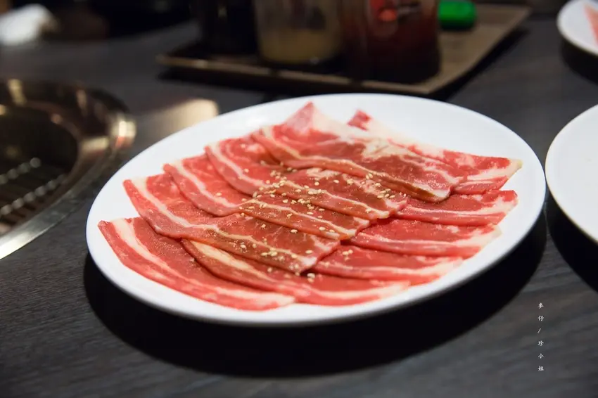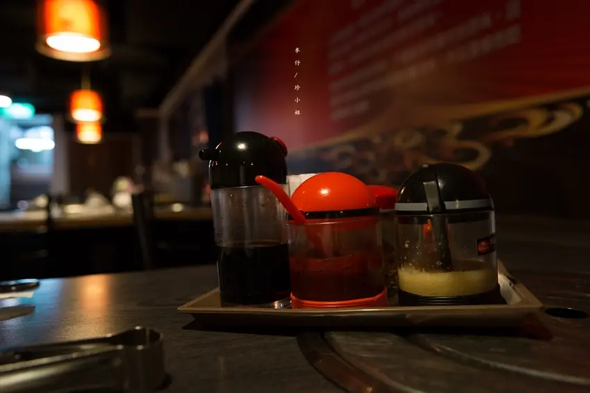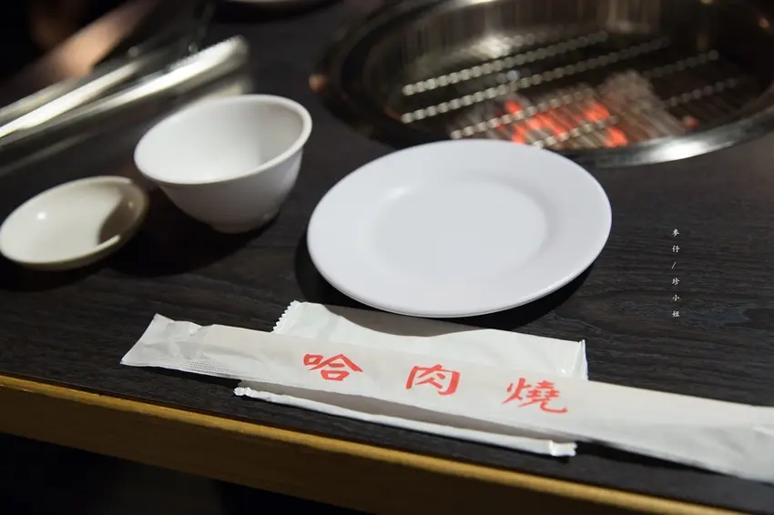 哈肉燒的店面外觀以醒目的大紅色調為主,室內裝潢則走樸實溫馨的路線,營造出宛如在家用餐般的輕鬆氛圍。店家將大部分的心力與成本皆投注於食材的挑選與處理上,因此餐具選擇簡約低調,將所有的視覺焦點留給盤中精修至完美無瑕的肉品。在調味方面,除了基本的鹽巴,店內特製的蘋果燒肉醬帶有天然的果香與微甜,搭配少許蒜泥與燒肉一同入口,不僅能提升肉汁的鮮甜,更能達到絕佳的解膩效果。高溫的嚴選木炭則確保了肉品能迅速鎖住肉汁,為整體燒肉體驗奠定完美的基礎。