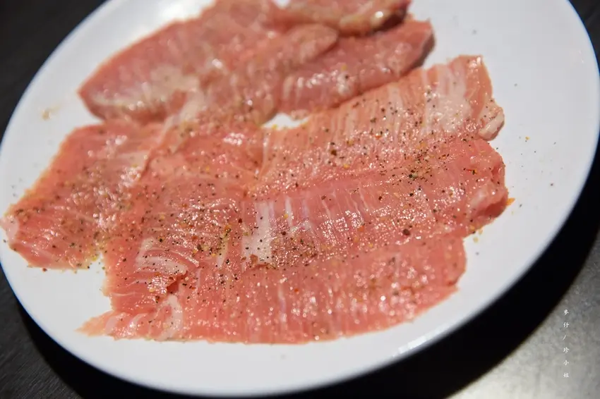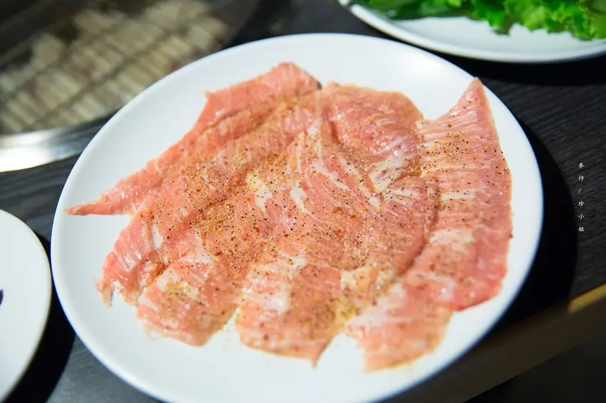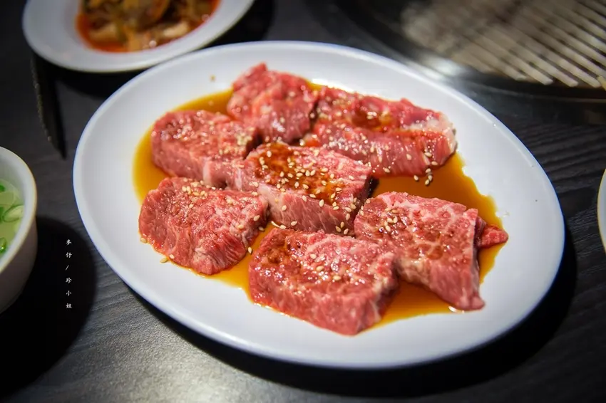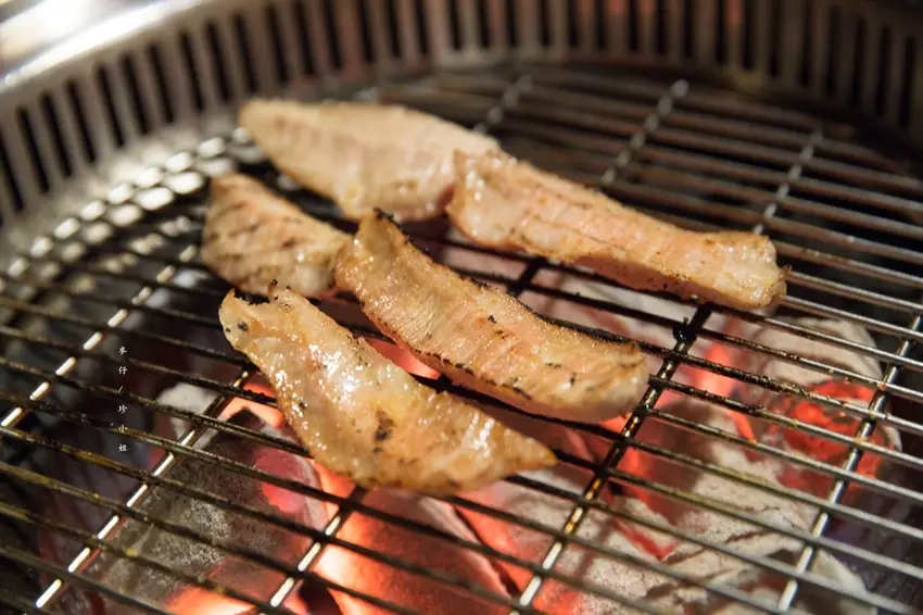 肉品首推店內的招牌「霜降豬肉」,即市面上少見的厚切松阪豬。為了保留肉質的最佳厚度與口感,店家捨棄了花俏的玫瑰花擺盤,將手掌大且厚實的豬肉片直接上桌。在高溫炭火的炙烤下,外表烤至金黃微焦,內裡依然保持軟嫩彈牙,咀嚼時散發出純粹的肉香而無絲毫腥味。另一款堪稱經典的「上五花牛」,更是展現了店家不惜成本的極致修肉工藝。每一塊牛肉皆被精準修整為四乘五公分的完美比例,均勻美麗的油花在烤爐上迅速變色,烤至五分熟入口,入口即化的軟嫩肉質絕對令人驚豔。
