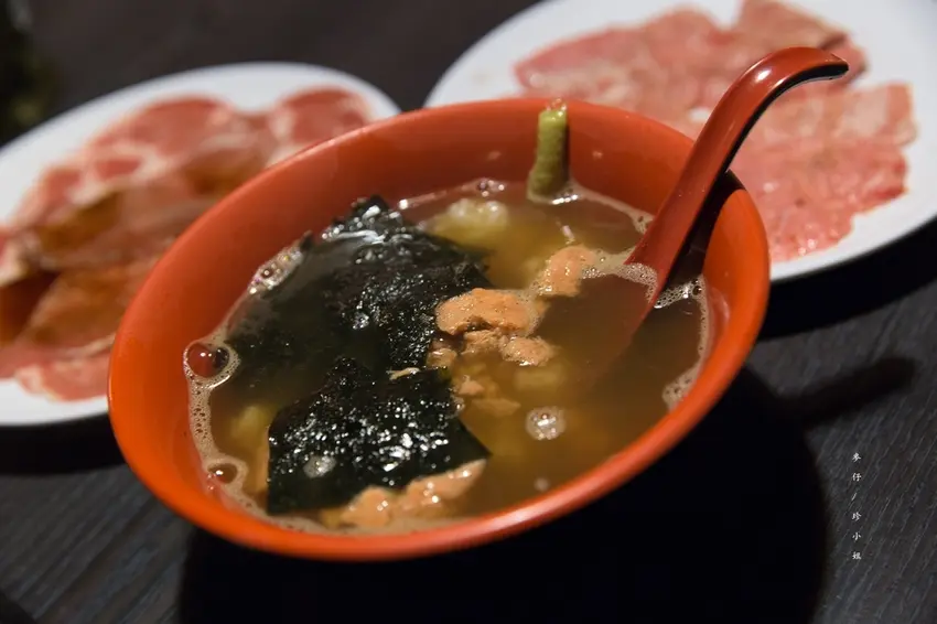入座後,店家會貼心送上每日新鮮熬煮的免費雞骨高湯。這款呈現誘人乳白色的濃郁湯品,喝起來醇厚溫潤且暖胃,撒上些許蔥花更能帶出迷人的香氣,是冷涼天氣裡的最佳開場。在主食部分,份量十足的「鮭魚茶泡飯」不僅能適度墊胃,其帶有適度鹹香的鮭魚肉搭配爽口湯頭與微嗆的芥末,口感層次相當豐富。若想平衡燒肉的油脂,推薦點上一盤大份量的和風「綜合沙拉」,微微酸甜的醬汁搭配新鮮生菜,能有效轉換味覺,讓顧客在品嚐大量肉類料理時依然能保持清爽的口感。