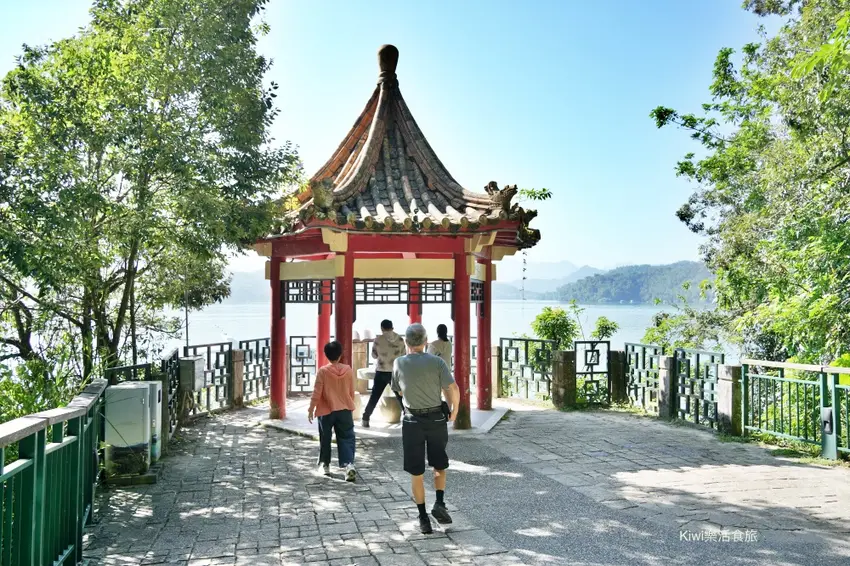 沿著蜿蜒的步道持續前行,便會途經一座充滿古典氣息的「育樂亭」。這座涼亭的地理位置極佳,其視角正對著湖中央的拉魯島與遠方的慈恩塔,三者在視覺上精準構成了一條完美的「幸福連線」。這項獨特的景觀吸引了無數情侶特地前來,對著平靜的湖水許下長相廝守的浪漫願望。此外,步道高處矗立著一座外觀呈現柔和鵝黃色的耶穌堂,周邊還保留了早年的衛兵崗哨。這些深具歷史意義的建築,如今已轉變為旅客乘涼休憩與拍照打卡的溫馨角落,增添了豐富的人文色彩。
