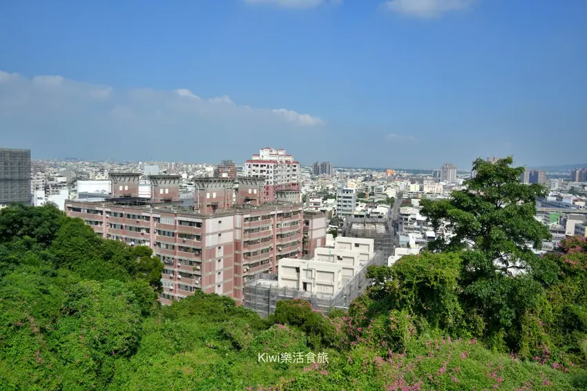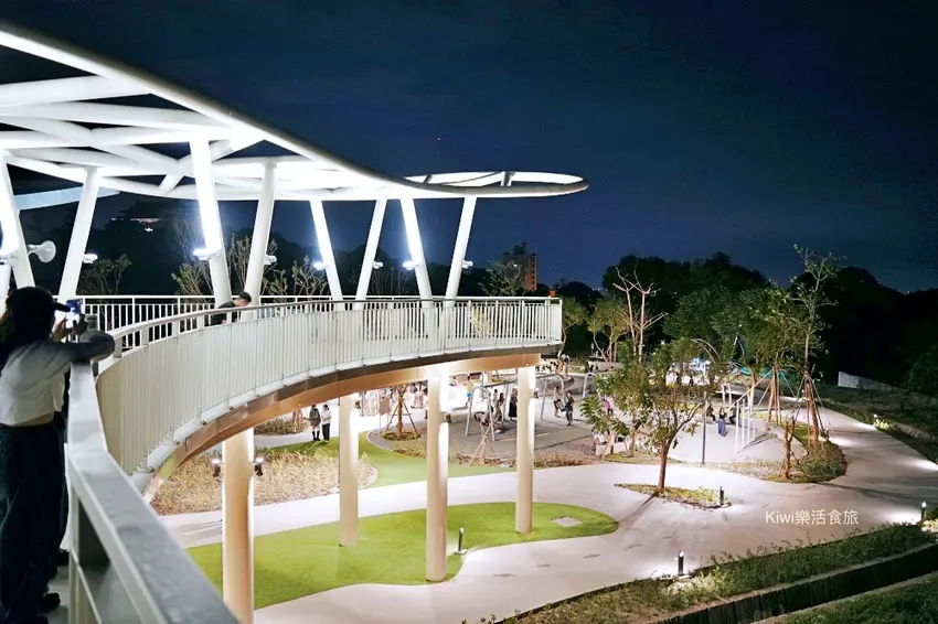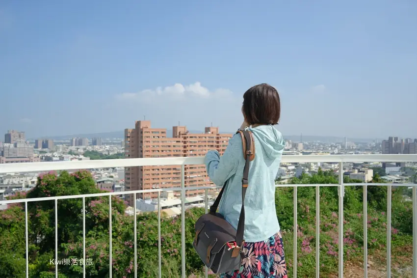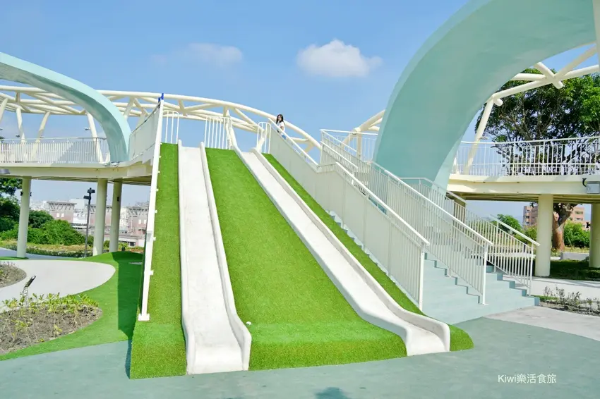 除了豐富的遊樂設施,天空遊戲場的建築結構亦蘊藏著觀景的驚喜。順著充滿設計感的旋轉樓梯拾級而上,便能抵達位於遊戲場二樓的專屬眺望台。站在這座位處綠意與藍天之間的景觀平台上,整體的視覺高度瞬間獲得提升,眼前的視野也隨之變得無比遼闊。從此處向下俯瞰,不僅能將無邊無際的彰化市區全景盡收眼底,甚至能清晰遠眺地平線的起伏輪廓。看著市區街道上如火柴盒般渺小的穿梭車流,城市的脈動在此刻顯得格外寧靜迷人。