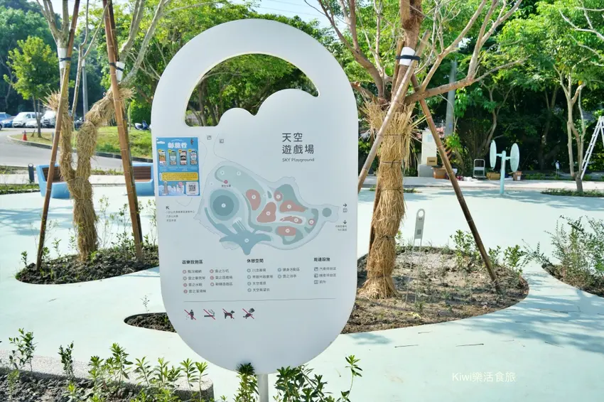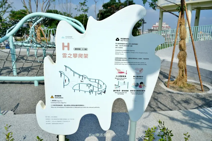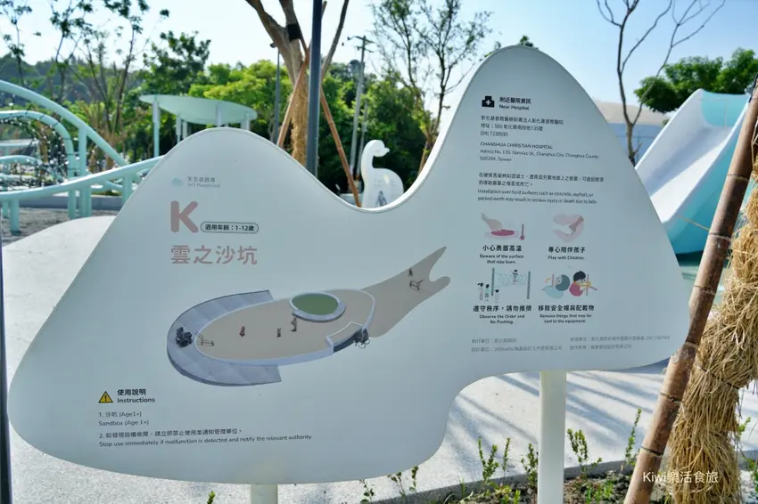 八卦山天空遊戲場最為人稱道的設計理念,在於其徹底落實了「全齡共融」的友善休閒空間。園區內平緩舒適的無障礙步道與青銀共融廣場,讓長輩能在此悠閒散步或安心休憩;而孩童則能在專屬的沙坑與鞦韆區域中盡情玩耍放電。整座遊戲場的色彩計畫極具巧思,大面積採用了清新脫俗的蒂芬妮藍色調,搭配周遭翠綠的自然林木,不僅在視覺上帶來極大的療癒感,更讓這座免費開放的親子景點,散發著宛如網美打卡勝地般的高級質感與脫俗氣息。