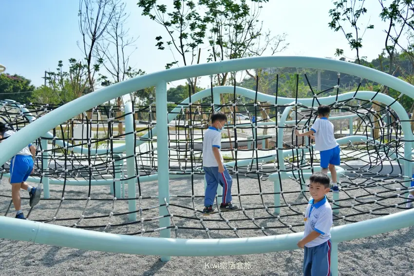 園區內最吸睛的核心遊具,莫過於那座造型極具流線美感的「雲之溜滑梯」。順著圓滑的曲線一路滑下,彷彿穿梭於柔軟的雲端之中,帶來極佳的遊樂體驗。緊鄰一旁的「飄浮繩網」則是專為喜愛挑戰的孩童所設計的離地冒險區域。堅固且具備彈性的編織網繩,提供了紮實的支撐力,讓孩童能如蜘蛛般靈活地在半空中攀爬穿梭。坐在充滿彈性的繩網上輕輕擺盪,整座山頭的綠意便會隨著視角晃入眼簾,帶來安全且充滿刺激感的離地飛行樂趣。