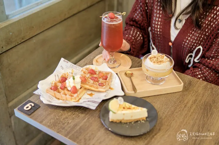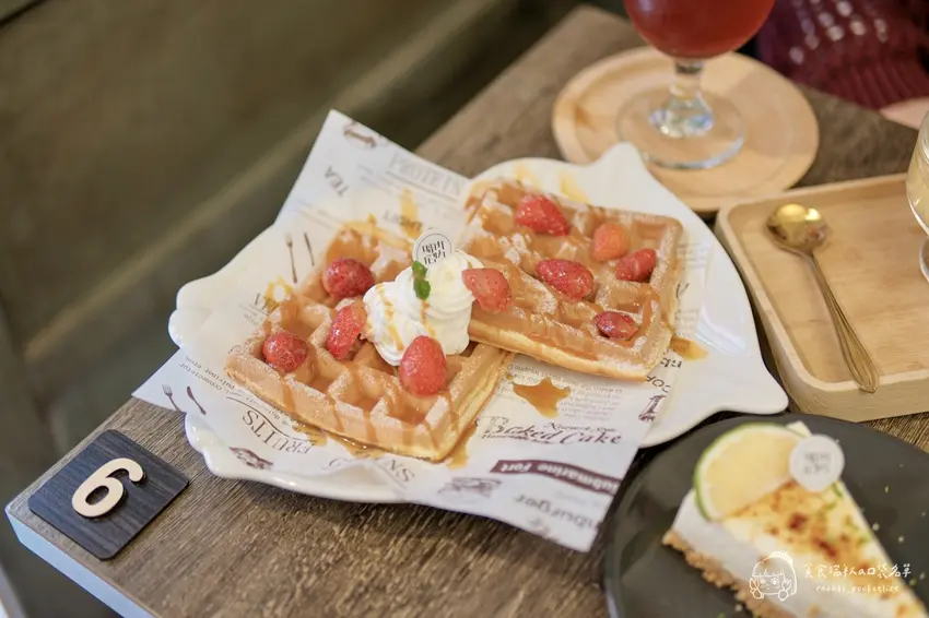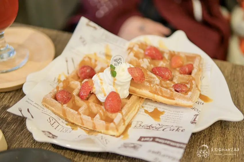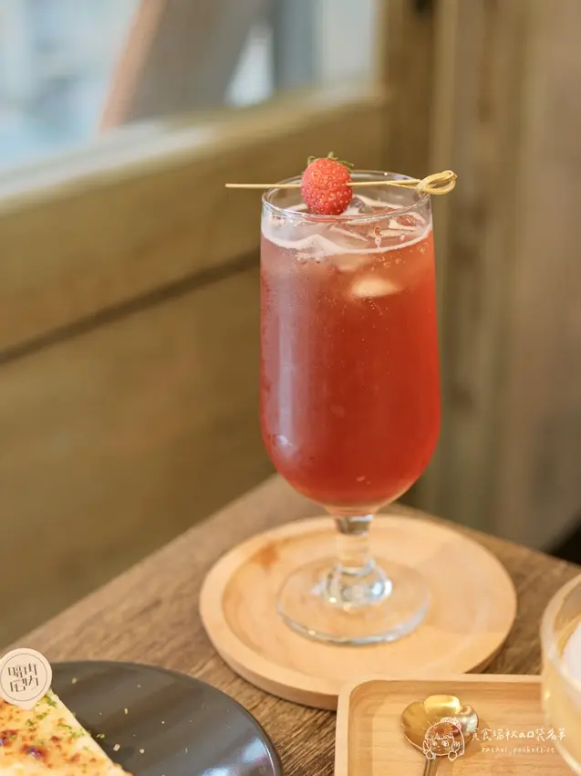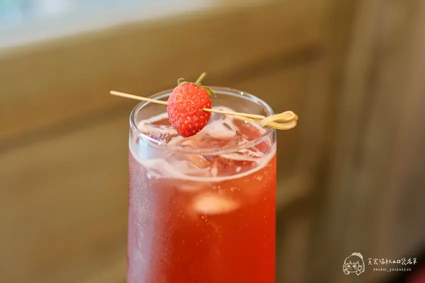 針對喜愛季節限定水果的饕客,店內亦推出了視覺與味覺雙重滿足的草莓系列品項。「草莓鬆餅」採用了口感偏向鬆軟且帶有Q度的特調麵糊,烘烤後邊緣微酥、內層則保有迷人的嚼勁,搭配當季採收的新鮮多汁草莓與滑順鮮奶油一同入口,層次極為豐富。飲品部分則強烈推薦「草莓氣泡飲」,將鮮甜的草莓果香與清爽的氣泡水完美結合,整體甜度刻意降低,喝起來不僅極度解膩且清涼消暑。將這兩款草莓系餐點搭配享用,絕對是午後悠閒時光中最完美的味覺饗宴。