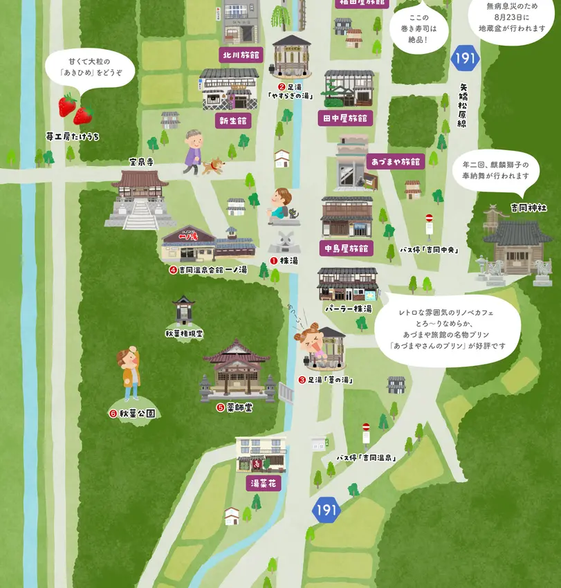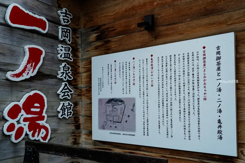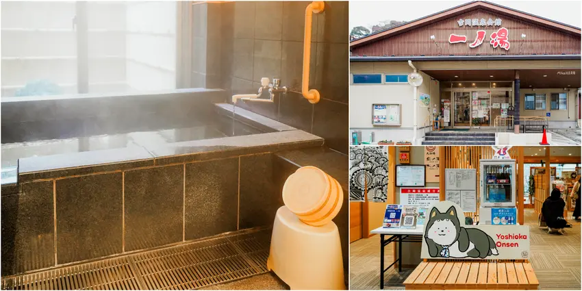 來到吉岡溫泉街的中央地帶,首先映入眼簾的便是宛如噴泉般不斷湧出泉水的「株湯地標」,這裡正是傳說中千年美肌秘湯的最早發源地。鄰近的公共日歸溫泉設施「吉岡溫泉會館一之湯」,以高達 51.3 度的 100% 天然源泉掛流聞名,完全不加水且不加熱的純淨泉質,泡完後肌膚呈現極致的滑順透亮。館內除了設有寬敞的室內外浴池與無障礙家庭包場風呂,最特別的便是首創需提前預約的「狗仔溫泉」寵物專屬泡湯池。大人僅需 700 日圓的親民入場費,便能讓旅客與毛小孩共同享受這份千年傳說的極致呵護。