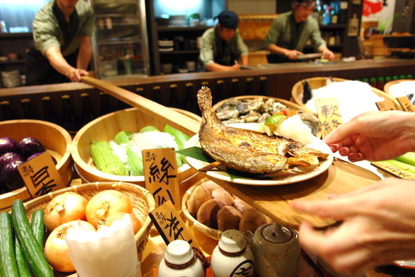 板前的展示熱鬧有餘,各式各樣的蔬果,活跳跳的海鮮,真想每樣來一個,與一般的燒烤店不同,爐端燒比較像燒烤店與海鮮海產店的結合體,真是新鮮看的見,菜市場就在眼前,想吃什麼,就點什麼。