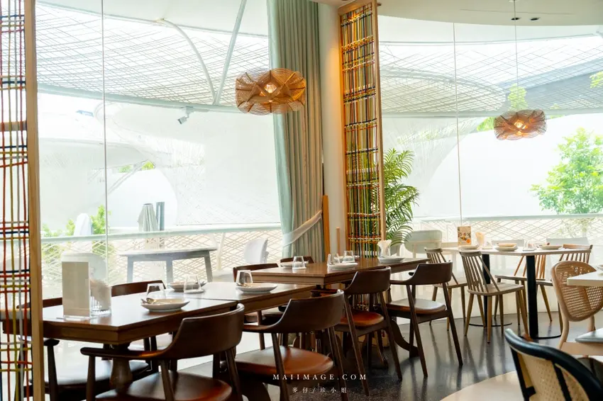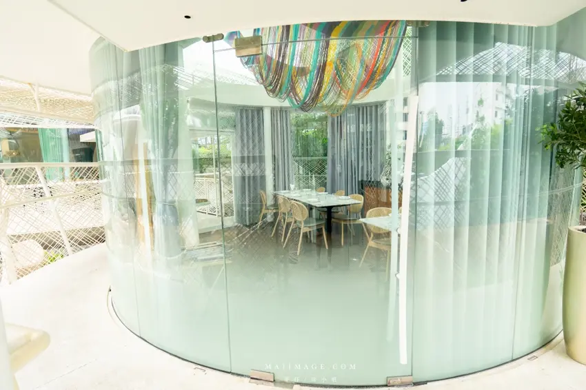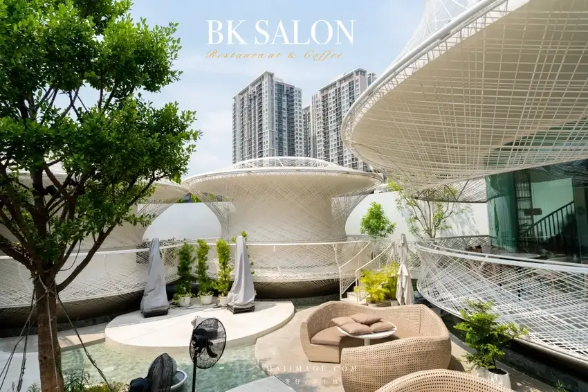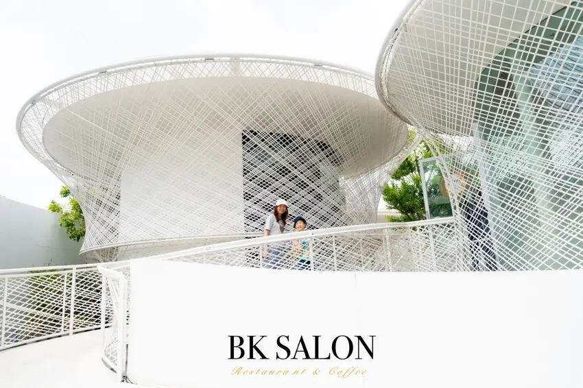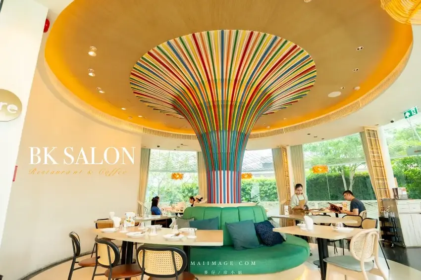BK SALON 的空間動線規劃極具層次感,從入口處的圓形拱門到連接各個竹簍空間的優雅坡道,處處皆展現了極致的建築美學。室內用餐區採用了溫潤的弧形沙發與極具現代感的設計餐椅,大面積的幾何玻璃窗將明亮的自然光線完美引入室內。在白天的陽光斜灑下,光影與窗邊的植栽相互映襯,營造出宛如藝廊般清新且優雅的獨特氛圍。無論是喜愛簡約冷淡風或文青質感的旅客,皆能在此尋得最完美的拍攝視角,輕鬆捕捉充滿仙氣的高質感美照。
