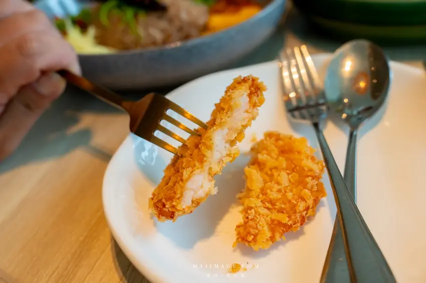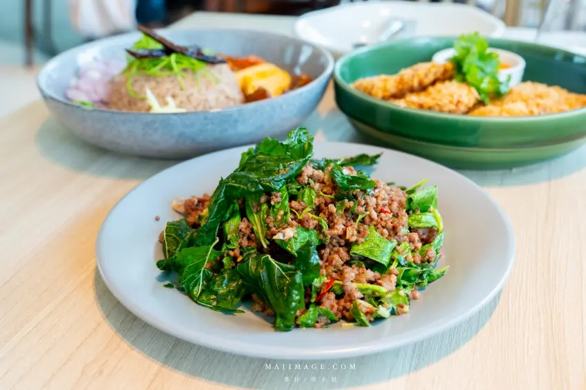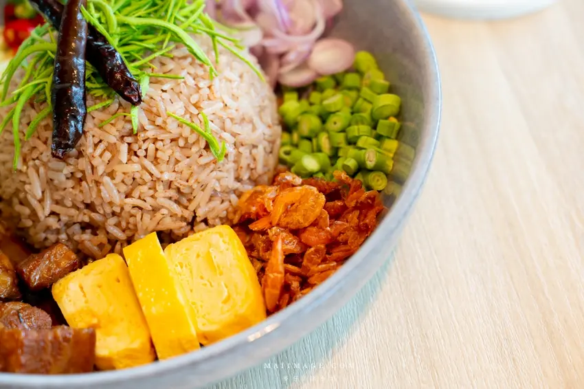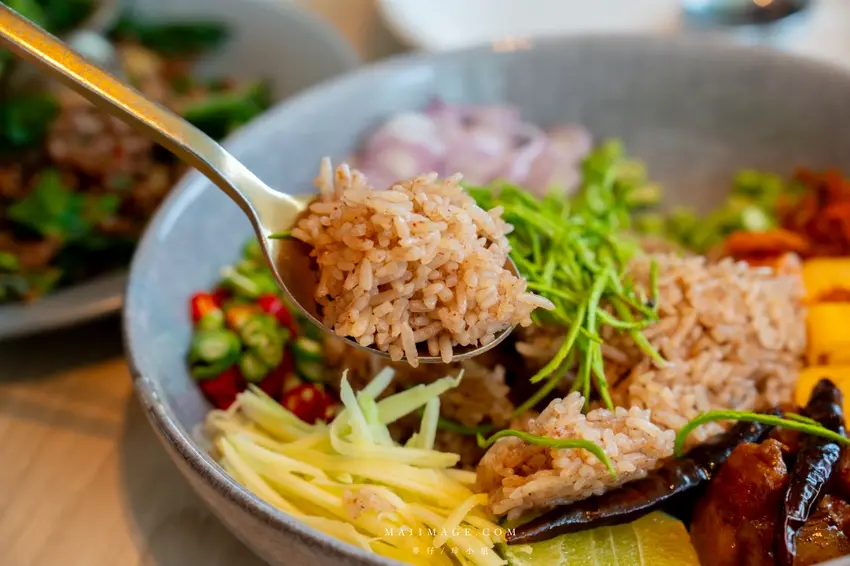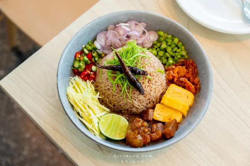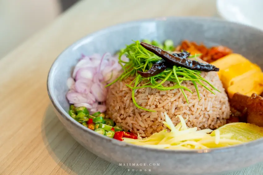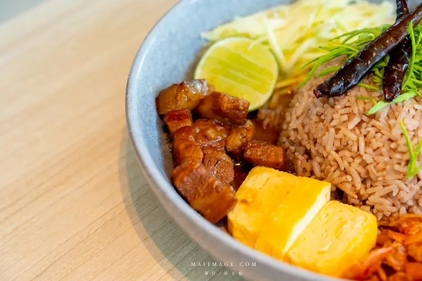 將泰國國民美食昇華至高級視覺系料理的「奶奶的秘製蝦醬炒飯」,是展現主廚深厚功力的代表作。盤中不僅有粒粒分明且吸附濃郁海味的蝦醬炒飯,周圍更精緻地環繞著日式玉子燒、鮮酸爽口的青芒果絲、醬香濃郁的特製燉肉,以及紅蔥頭與生辣椒等豐富配料。這道宛如藝術品般的佳餚,讓饕客能隨心所欲地將蝦醬的鹹香、芒果的酸甜與辣椒的辛辣自由搭配。各種頂級食材在口中碰撞出層次分明且變化萬千的絕妙口感,令人回味無窮。