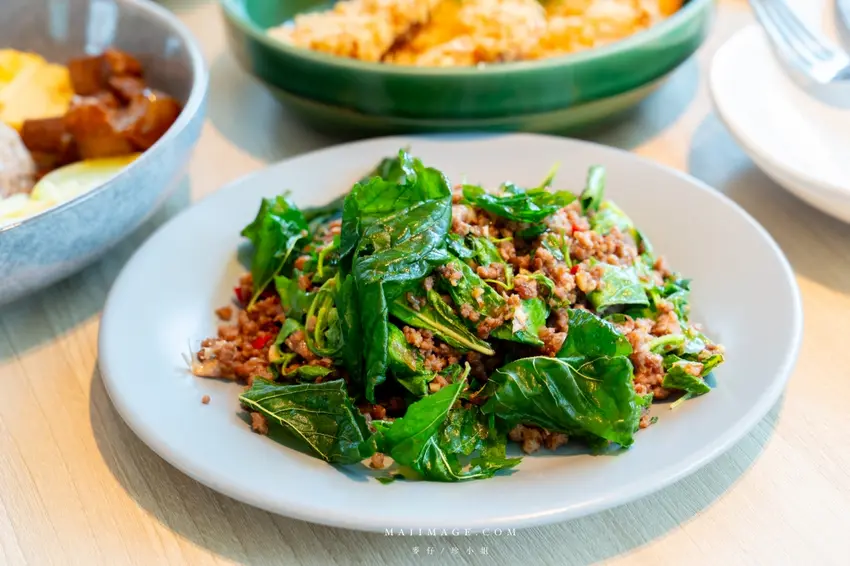 在鹹食的表現上,絕對必點這道香氣撲鼻的「經典打拋豬牛」。主廚將打拋葉、辣椒與濃郁蒜香完美融合,選用肉質精瘦卻不乾柴的頂級牛肉,拌炒至極度入味且多汁,恰到好處的微辣感極度開胃,讓人忍不住大口扒飯。另一道廣受好評的「小少爺金錢蝦餅」,金黃酥脆的外皮下包裹著極度彈牙的鮮蝦漿。每一口皆能咀嚼到真材實料的飽滿蝦肉纖維,絲毫沒有過度添加麵粉的粉膩感,搭配店家特調的酸甜梅子醬汁一同享用,整體風味更加清爽解膩。