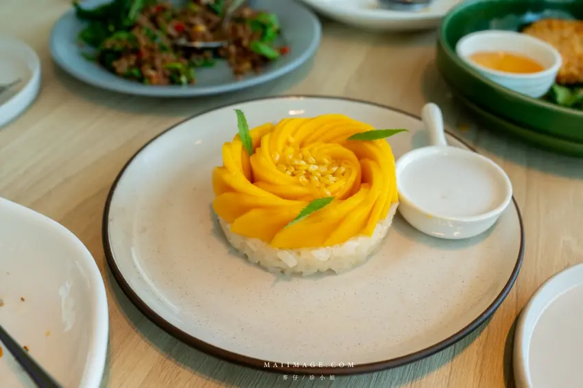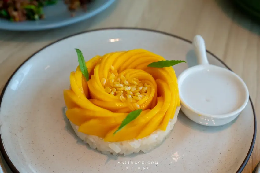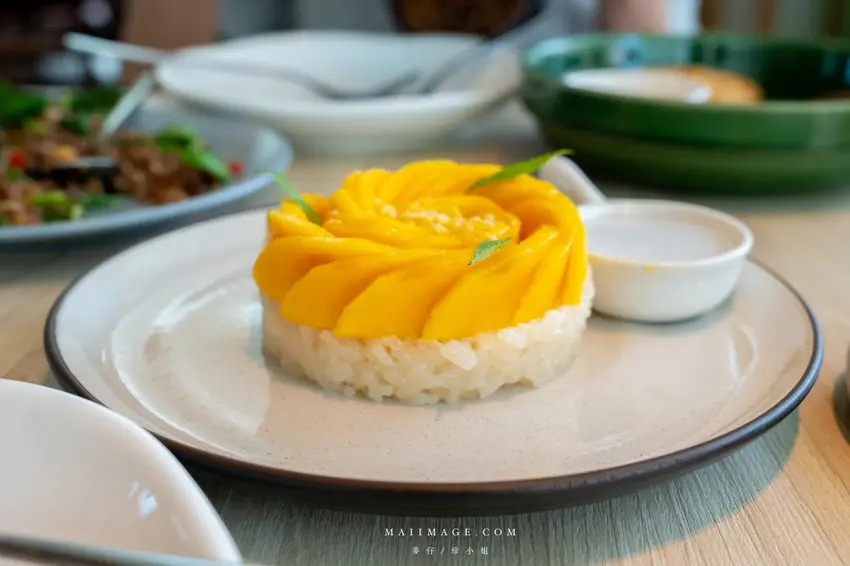餐後的甜點時光,極力推薦這道視覺極度震撼的「芒果糯米飯」。主廚發揮巧思,將熟度完美、酸甜多汁的新鮮芒果切片,精心拼排出宛如盛開玫瑰花般的絕美造型。底層搭配著熟度適中、Q彈不黏牙的優質糯米,淋上帶有淡淡微鹹的特製椰漿以完美中和甜膩感,表面更撒上酥脆的米粒增添豐富層次。在交通規劃上,建議搭乘 BTS 至 Chong Nonsi 站後轉乘計程車前往。若想拍出最美的建築光影,建議於下午 3 點半左右抵達,還能巧妙避開傍晚可怕的塞車潮。