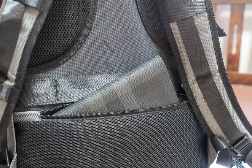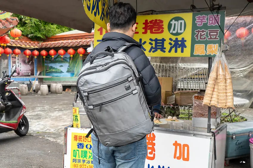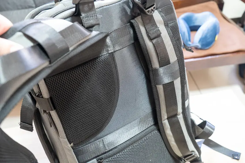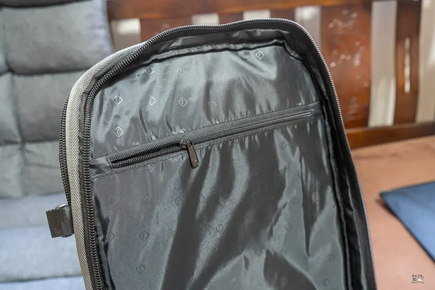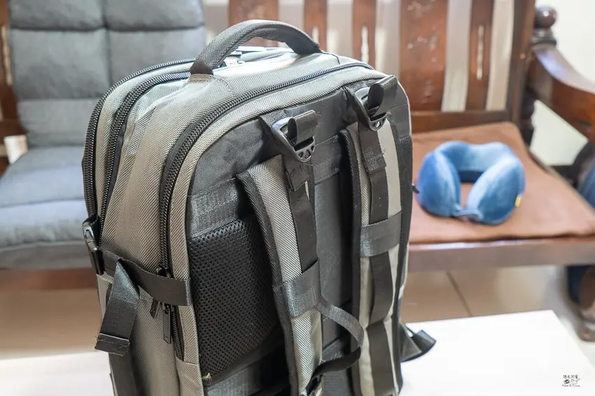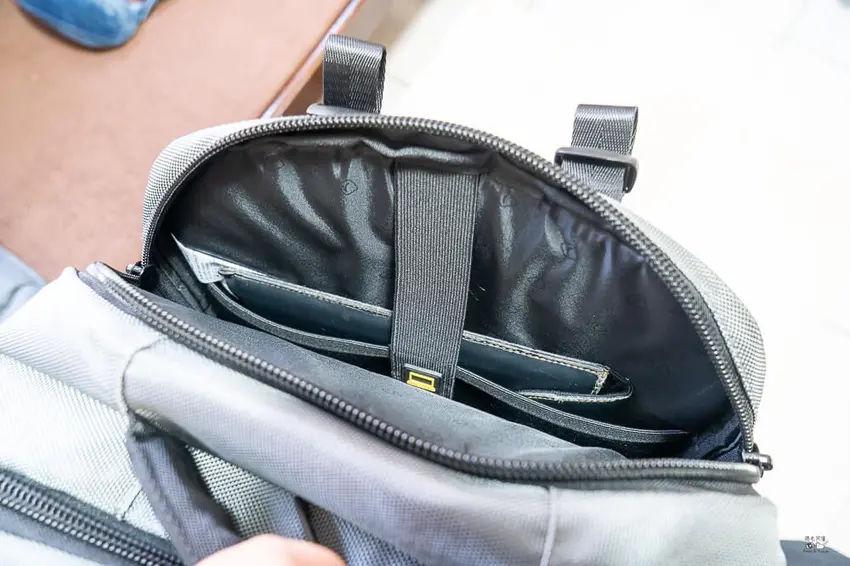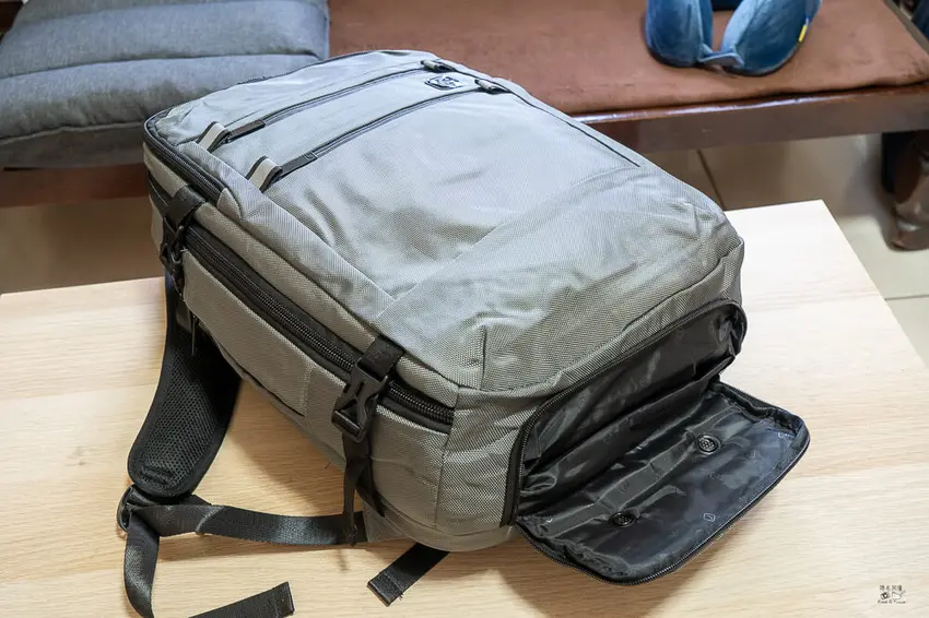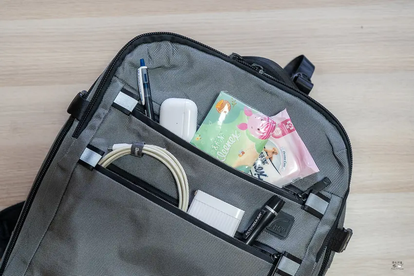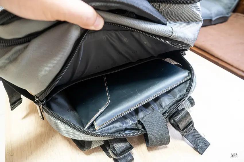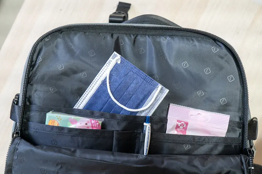 背包整體規劃了三個採用雙開式滑順拉鍊的獨立大夾層。最外層適合收納濕紙巾、耳機與隨身充電線等需要頻繁拿取的小型物件。中間的主夾層則擁有極深的收納腹地,並設計了豐富的網袋與分層,讓旅客能像使用行李箱般將衣物與盥洗用品井然有序地分類歸位。最靠近背部的第三層,則是專為 3C 產品打造的防護空間,最大可安全容納高達 18.6 吋的筆記型電腦。這項設計讓商務旅客在通過機場安檢 X 光機時,能夠極為迅速流暢地將筆電單獨抽出,省去了翻找與重新打包的繁瑣過程。