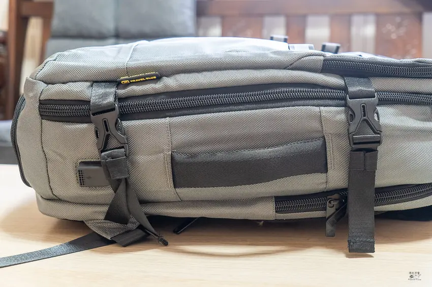 為了因應旅途中各種不同的移動場景,背包除了傳統的頂部提把外,更在側邊增設了堅固的加厚握把。無論是在擁擠的機艙內將背包放上頭頂行李架,或是短距離進出飯店與車站,都能直接將其作為手提旅行袋般輕鬆拿取。而在科技機能方面,背包側邊內建了實用的 USB 外接充電插孔。旅客只需預先將個人的行動電源連接至包內的專屬線材,在旅途中移動時便無須一直將笨重的行動電源拿在手上,只需將充電線插入背包外側的接口,即可隨時為手機補充流失的電量,真正實現解放雙手的便利性。
