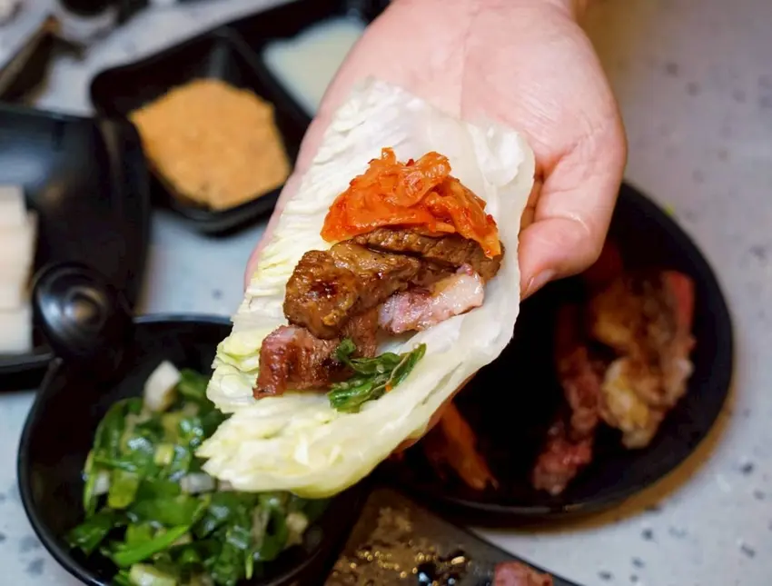 將牛肉包入生菜,再加上一點泡菜,一口咬下去就能同時感受到鮮嫩多汁的牛肉、清脆爽口的生菜,還有微酸微辣的泡菜提味,多層次的口感瞬間在嘴裡爆開,吃起來既清爽又過癮,完全停不下來!