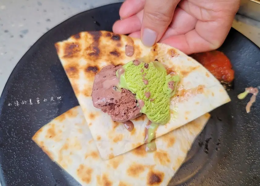 每一次來都必點的還有墨西哥烤餅,以往都是將烤餅當生菜包肉吃,這一次小涼嘗試了將烤餅包上冰淇淋吃,想不到更對味也更好吃捏,建議大家可以試試唷~