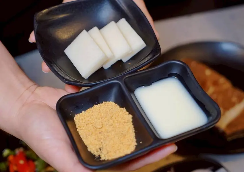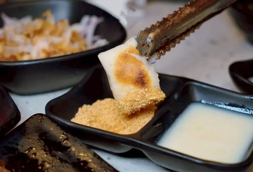 剛烤好的麻糬暖呼呼、香氣迷人,沾上煉乳再撒點花生粉,甜而不膩、香濃又滿足,完全是燒肉吃到飽的甜點必殺款!