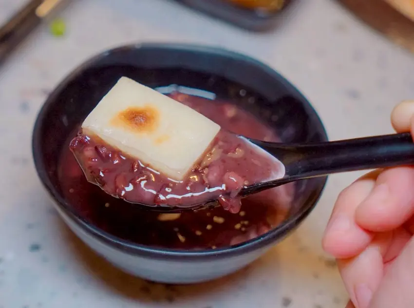 把烤好的日式麻糬放進紅豆紫米粥一起吃,瞬間有種在日本吃紅豆糰子的感覺。麻糬的Q彈香軟和紅豆紫米的綿密甜香融合,每一口都暖心又療癒,甜而不膩更好吃囉!