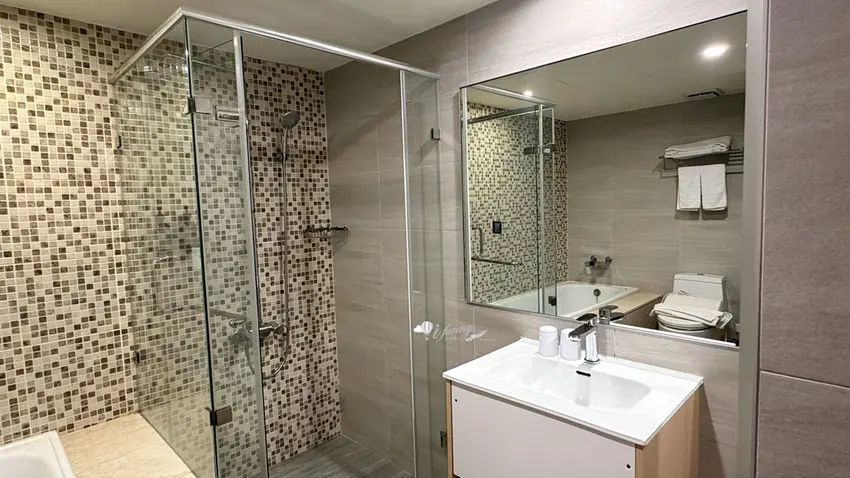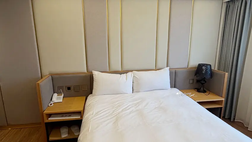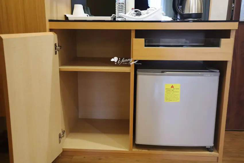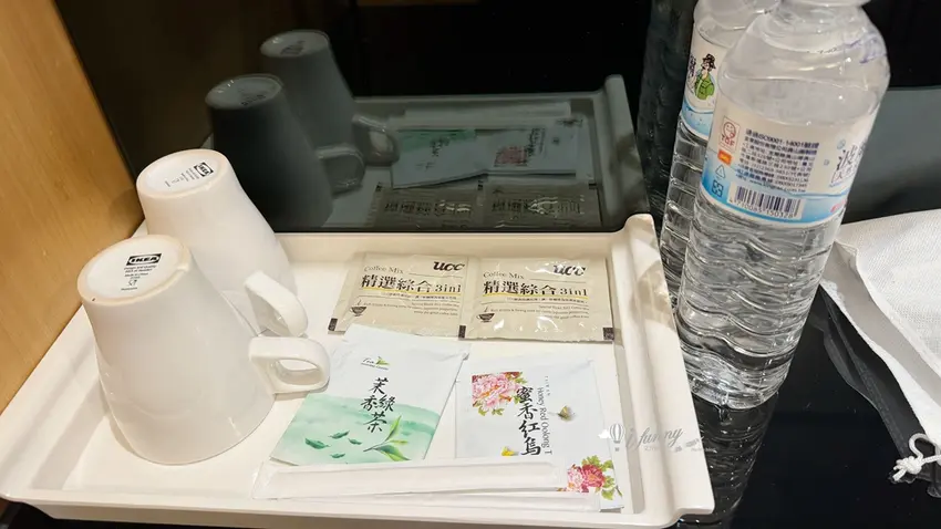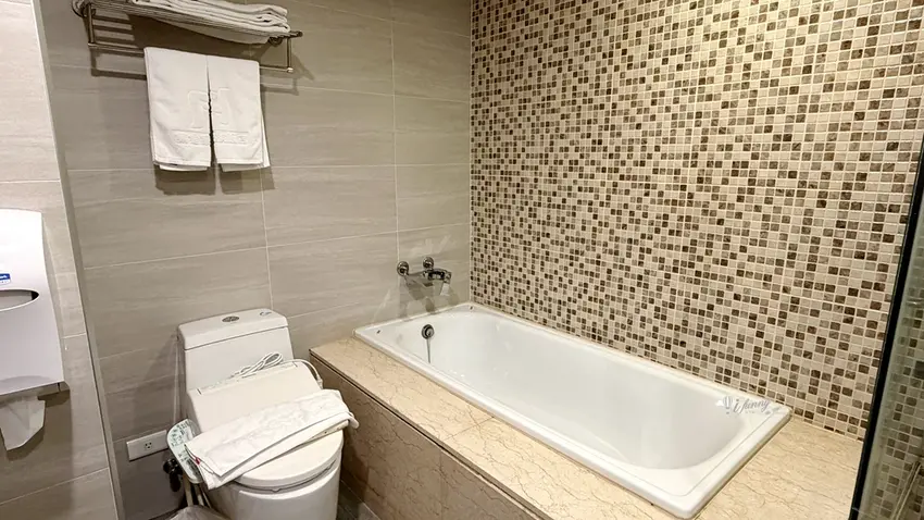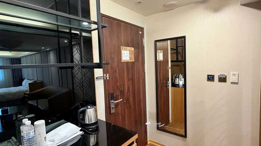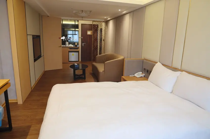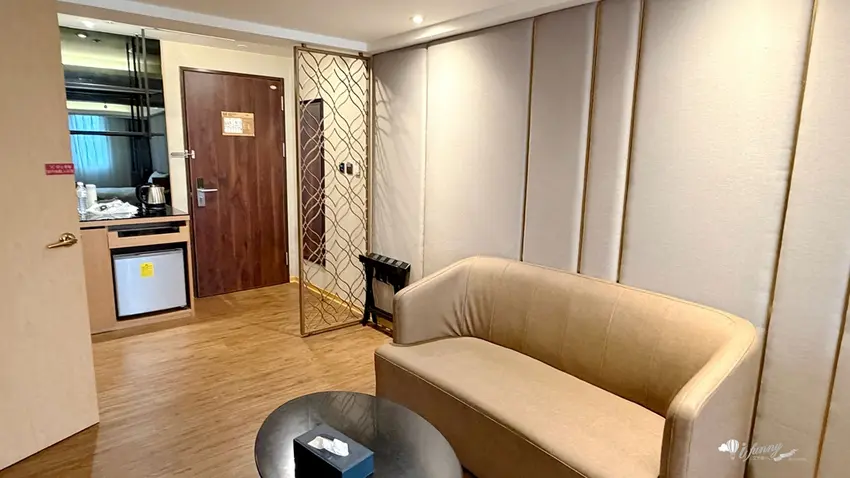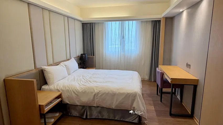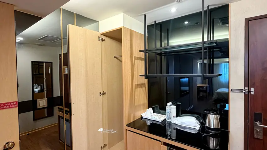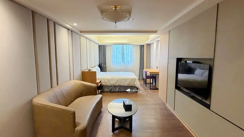在客房設計方面,以約 9 坪大的「行政雙人房」為例,整體格局方正且空間極為寬敞。房內不僅配置了舒適的雙人床與客廳小沙發,更備妥了電視、冷氣、辦公書桌與專屬網路,充分滿足商務旅客的辦公需求。玄關處設有實用的大面穿衣鏡與行李整理架,迷你吧則提供瓶裝水、熱水壺與各式茶包,下方的小冰箱方便旅客存放從夜市買回的冷飲。乾濕分離的寬敞衛浴空間是一大亮點,不僅配備了免治馬桶,更附設了能洗去一身疲憊的舒適浴缸,搭配風力強勁的吹風機,帶來極佳的沐浴體驗。
