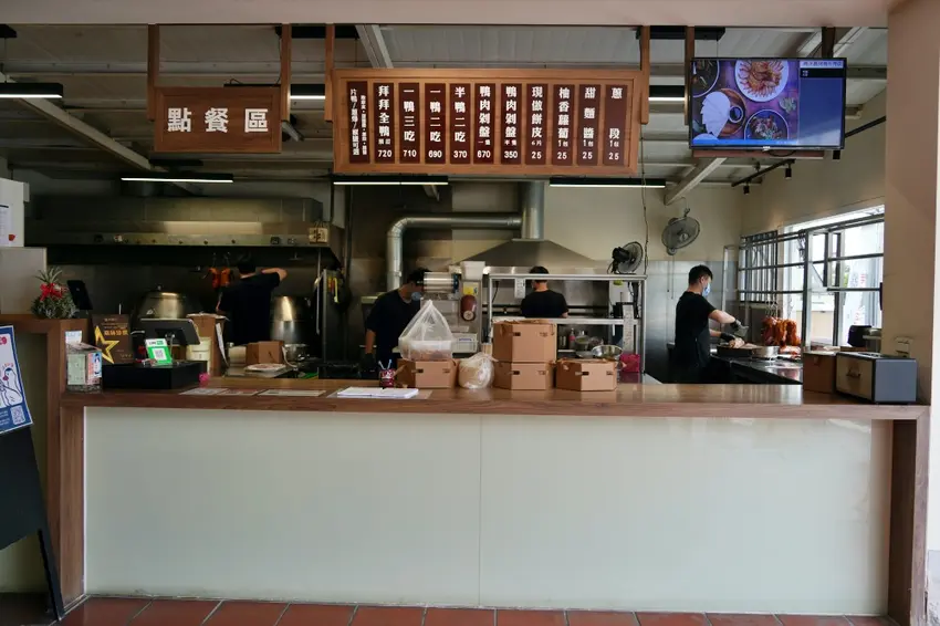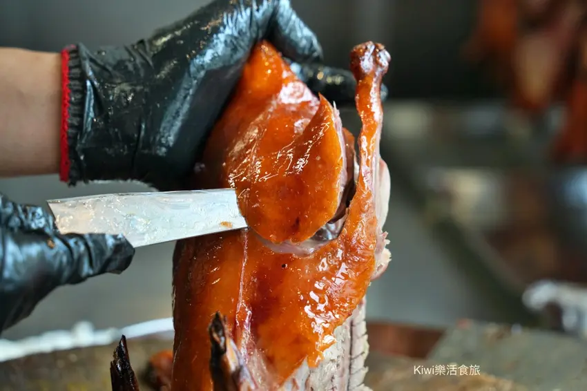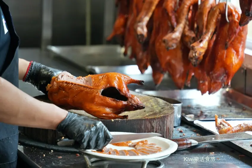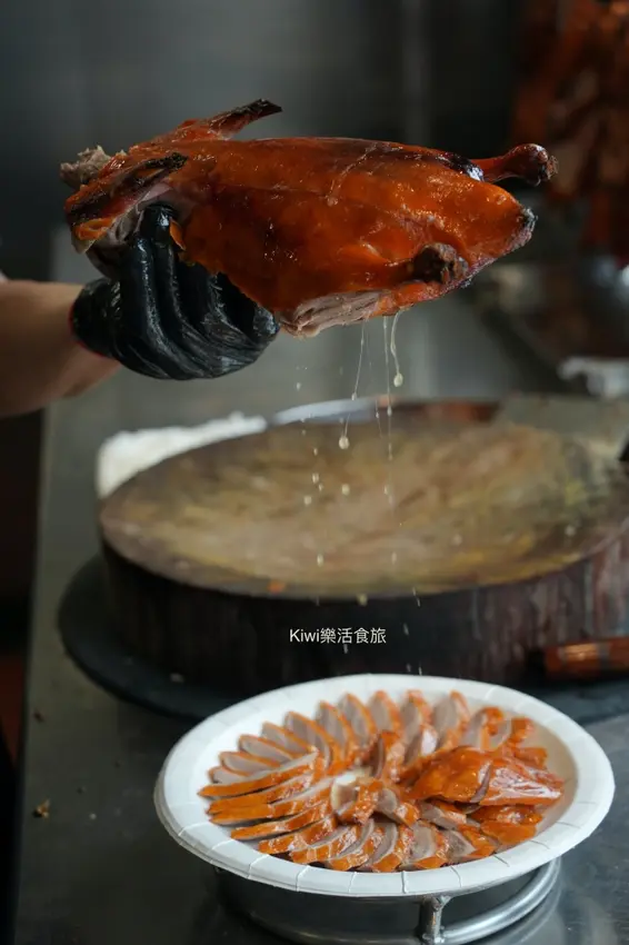鴨沐農之所以能在當地迅速累積好口碑,關鍵在於對鴨隻品質的極度堅持。店家只選用每天在陽光下充足活動、飼養滿 75 天的優質土番鴨。這種鴨隻的肉質極度紮實且 Q 彈有勁,遠非一般冷凍鴨肉所能比擬。在烘烤過程中,師傅展現了深厚的控火功力,先以高溫逼出多餘油脂並鎖住鮮甜肉汁,接著轉以小火慢烤,將外皮烤至透亮發光。那一隻隻掛在爐邊、閃耀著琥珀色澤的烤鴨,不僅是視覺上的極致饗宴,更完美保留了鴨肉最純粹的自然鮮美。