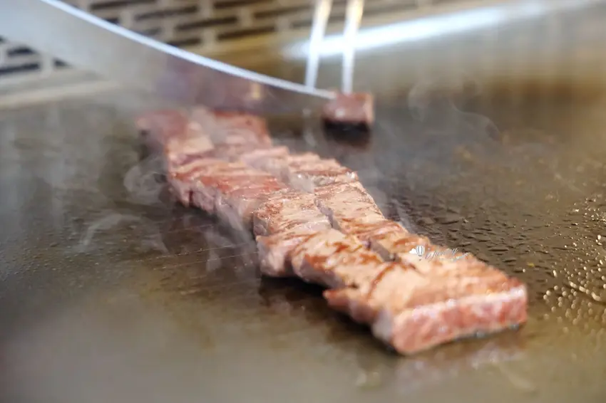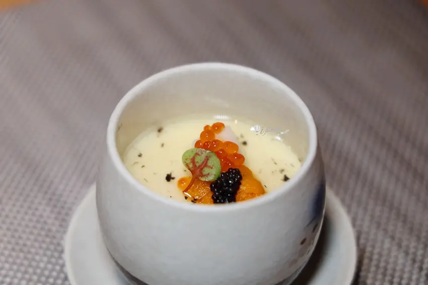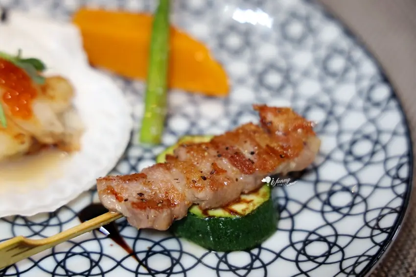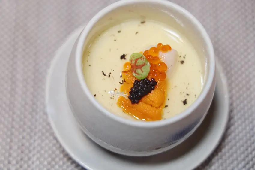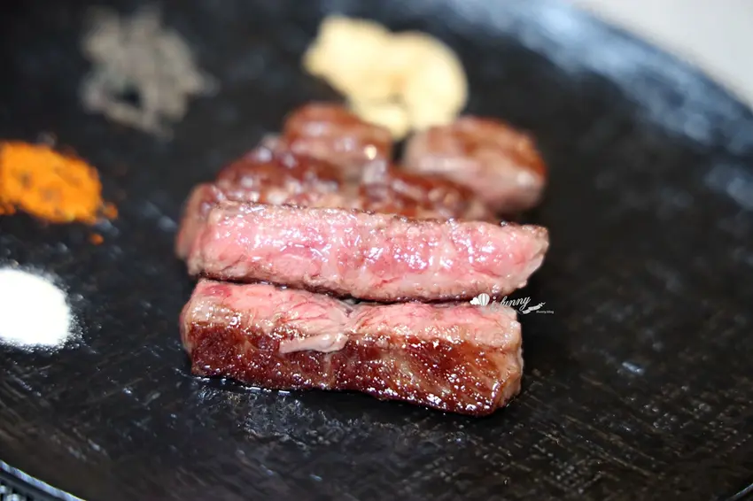 堪稱濃縮海洋精華的「海鮮茶碗蒸」,以絲綢般綿密的蛋液為基底,豪邁地加入了嫩彈干貝、鮭魚卵、海膽與珍貴的魚子醬。溫熱的海膽宛如鮮奶油般滑順,強烈的甘甜與魚子醬深邃的鹽味在舌尖交織,將鮮味層次拉升至最高點。重頭戲「美國無骨牛小排」則完美展現了主廚控溫的功力。鐵板高溫迅速逼出豐富油脂,形成深褐色的焦脆表層。富含彈性的膠質與軟嫩的肉質達到絕佳平衡,咀嚼時爆發出的濃郁牛油香氣,搭配一旁的炸蒜片與昆布鹽一同享用,堪稱極致享受。