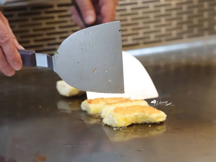 套餐的尾聲,主廚以不額外添加沙拉油的方式,直接將牛筋於鐵板上爆炒逼出天然牛油。在快速翻炒下,每粒米飯皆均勻包裹著閃亮的金黃油脂,口感乾爽且帶有迷人的焦香。點綴其中的飛魚卵與軟糖般嚼勁的牛筋丁,讓這道「牛筋炒飯」每一口都充滿驚喜。最後的餐後甜點則以鐵板現煎的香蕉煎餅、濃郁布朗尼與新鮮草莓擔綱,焦糖化的香蕉外殼帶有迷人的微苦甜味,搭配一杯解膩的熱菊花茶,為這趟高性價比的無菜單海陸饗宴畫下最完美的句點。