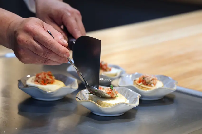 入座後,這場頂級饗宴由層次豐富的精緻前菜揭開序幕。主廚巧妙結合了炙燒鮭魚、深邃鮮味的墨魚麵,以及油脂豐厚的鰈魚鰭邊肉。點綴其上的鮭魚卵爆發出迷人的鹹鮮味,搭配特製的蕃茄芥末籽醬,酸甜微辛的風味完美平衡了魚肉的豐厚油脂,極度開胃。緊接著登場的「龍膽石斑魚海鮮清湯」極具儀式感,湯碗內盛裝著厚實 Q 彈的龍膽石斑、爽脆的峨螺貝與鴻禧菇,隨後注入帶著淡淡薑味的清爽湯底。純粹的海鮮甘甜與豐富的膠原蛋白完美交織,暖胃又暖心。品嚐完暖胃清湯,主廚會在鐵板上加熱「軟法切片」烙出金黃色澤,並豪邁放上特製鮪魚莎莎醬,酥脆麵香與莎莎醬的酸辛風味完美契合,層次感令人驚豔。