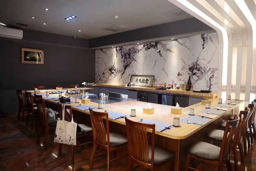 海童鐵板料亭擁有極佳的地理位置,距離機場捷運 A17 領航站僅約 500 公尺,出站後步行 7 分鐘即可輕鬆抵達,對於搭乘大眾運輸的旅客相當便利。若選擇自行驅車前往,餐廳周邊設有路邊停車格,正對面亦有收費停車場可供使用。走進店內,整體裝潢設計極具質感,透過俐落的線條、柔和的燈光與優雅的藍色窗簾,營造出沉穩的高級氛圍。主要的鐵板搖滾區可近距離觀賞主廚揮灑鍋鏟的精湛廚藝;針對注重隱私的客群,餐廳亦備有獨立包廂空間,可同時容納 18 人聚餐,強烈建議有包廂需求的旅客務必事先預約。