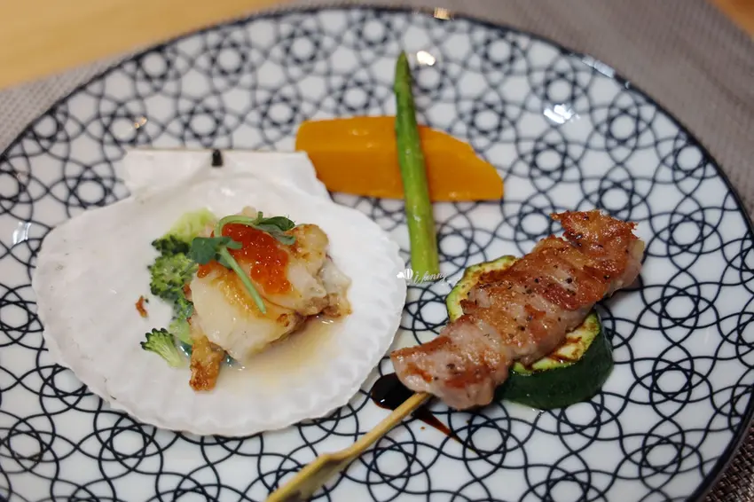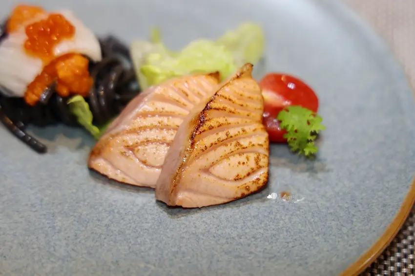 精緻前菜炙鮭魚,龍膽石斑海鮮湯