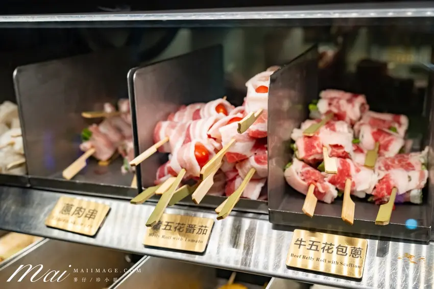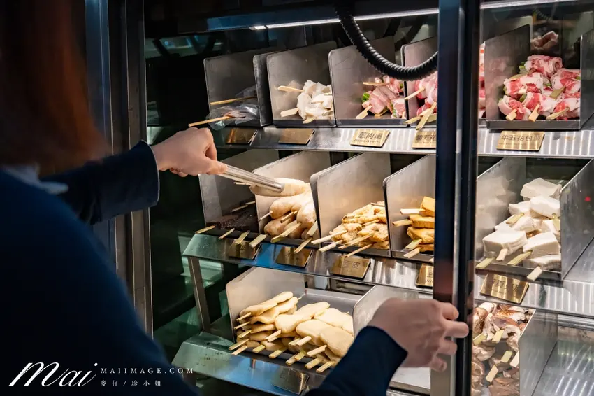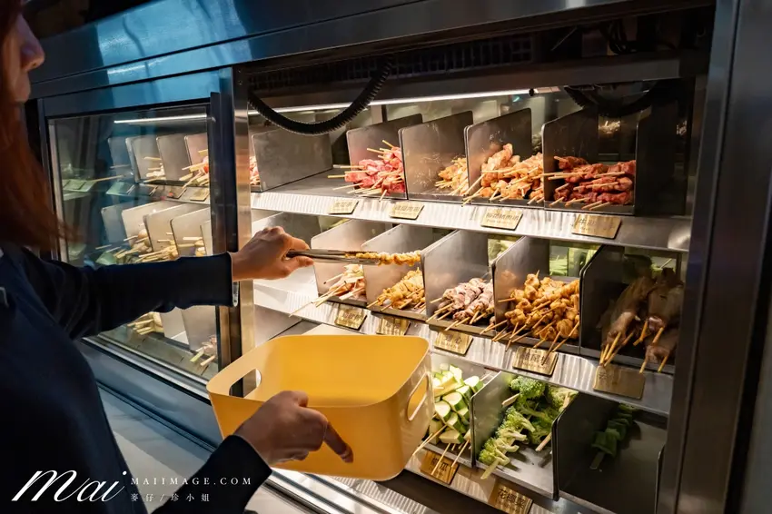 店內的點餐方式相當彈性多元。各式串燒會整齊陳列於前方的透明冰櫃中,上方清楚標示了品名與實惠的價格,顧客可依個人喜好自由夾取;而私房料理與酒水飲品,則可透過掃描桌面上的 QR Code 直接使用手機點餐。在食材的保鮮與衛生控管上,店家展現了極高的標準。每一款串燒皆有專屬的獨立擺放區域,部分食材更會以塑膠袋特別包覆隔離,確保顧客在挑選時能感受到絕對的乾淨與安心。入座後,店家還會貼心招待美味的開胃小菜,為接下來的串燒饗宴完美暖場。