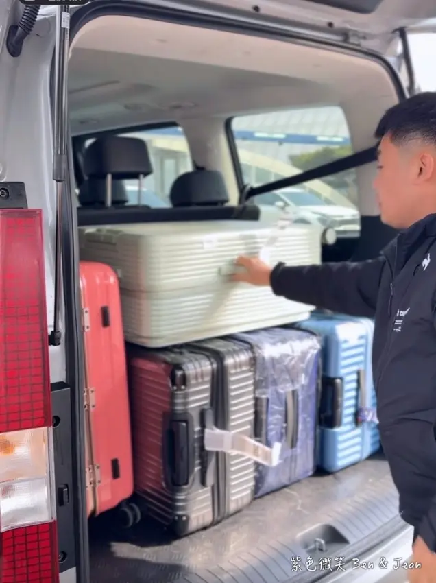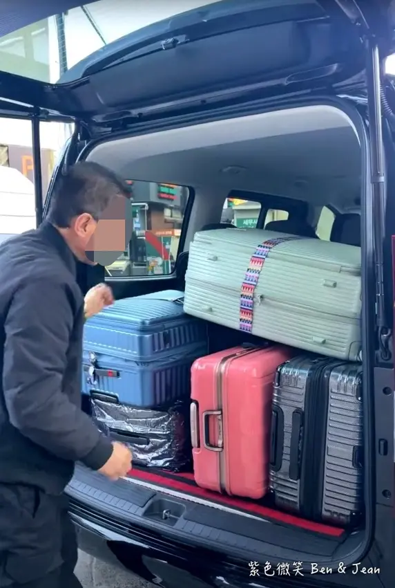 我們預約的是 7 人座大車,內部寬敞且環境整潔。不僅能輕鬆塞進 5 件 28 吋大行李箱,坐起來也非常舒適。對於剛結束長途飛行或回程血拚完的旅人來說,這段直達飯店的車程是絕佳的補眠與休息時間喔!