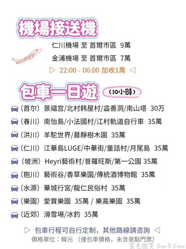 - 出發前1~2兩天line拉群組、安排中文司機,到時候直接支付給司機韓幣現金就OK囉!