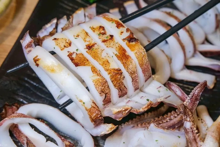 ▼超大尾的限量QQ軟絲,肉質Q嫩鮮甜,搭配芥末味的椒鹽品嚐很搭。