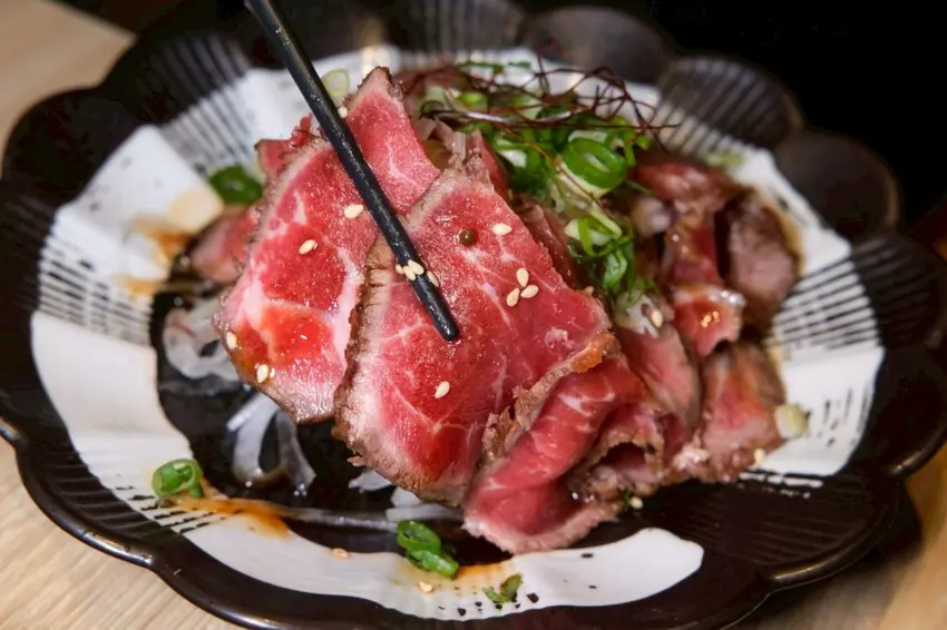 ▼光看賣相就超誘人的生牛肉,搭配底部的涼拌洋蔥很解膩,軟嫩好咬,敢吃生食的朋友不能錯過!