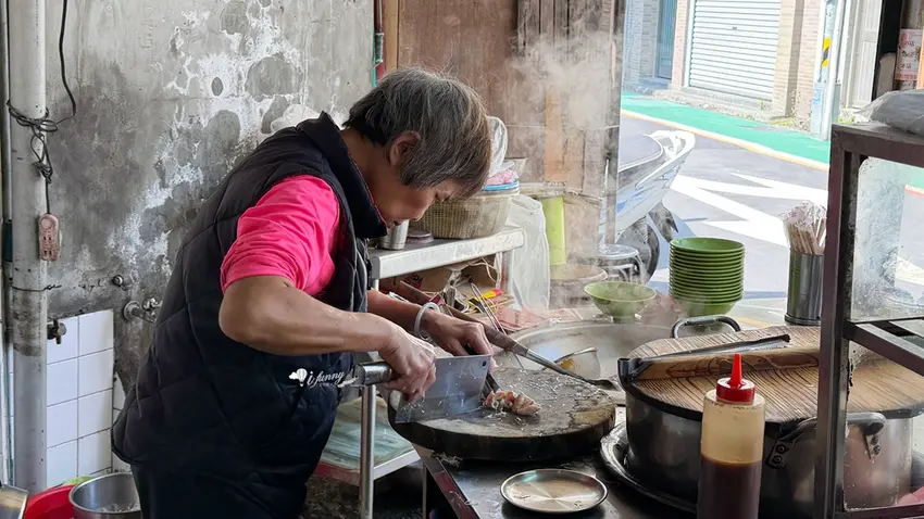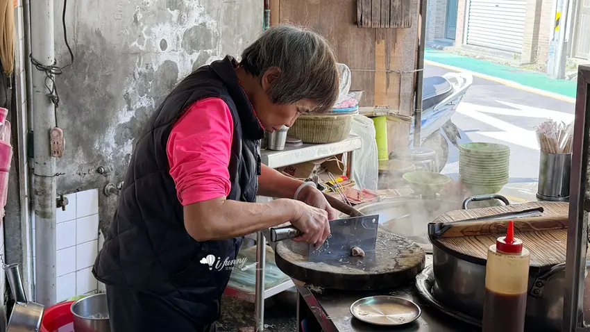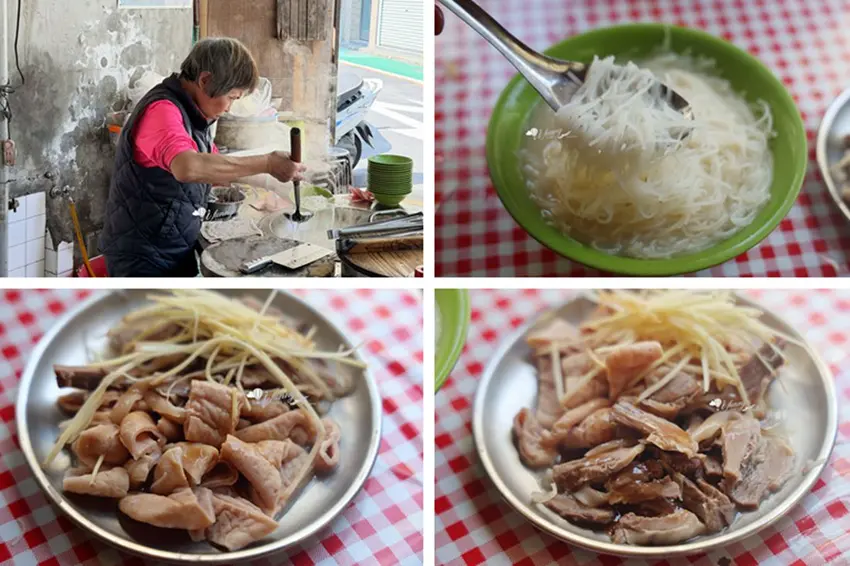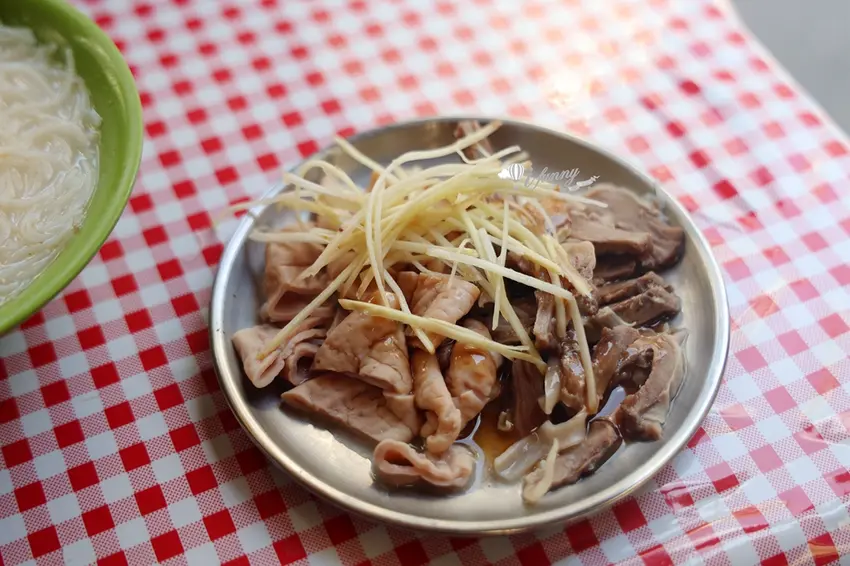 來到傳統米粉湯攤,絕對少不了點上幾份「黑白切」作為靈魂配菜。這裡的小菜處理得極為乾淨,絲毫沒有令人畏懼的內臟腥味。上桌前,店家會佐以少許的蒜味醬油與新鮮薑絲提味。極度推薦口感 Q 彈脆口的「肝連」,帶有豐富筋膜的肉質保有滿滿肉汁;而處理得恰到好處的「大腸」,不僅保留了特有的嚼勁,孔隙中更吸滿了大骨高湯的鮮甜,越嚼越香,是搭配米粉湯的完美首選。