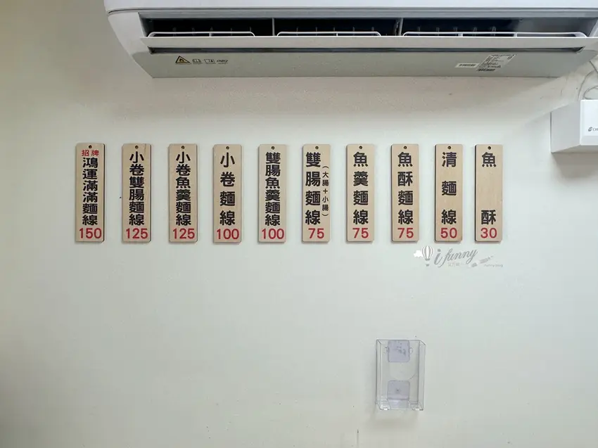 菜單設計靈活多樣,提供定價 50 元起的清麵線作為基底,顧客可依個人喜好自由搭配魚酥、魚羹、雙腸與小卷等豐富配料。其中最具話題性的「招牌鴻運滿滿麵線」定價 150 元,將所有精華配料一次鋪滿,份量多到幾乎看不見底下的麵線。表面再佐以蒜泥與香菜提味,呈現出融合海鮮鮮甜與滷味鹹香的全滿貫極致風味。