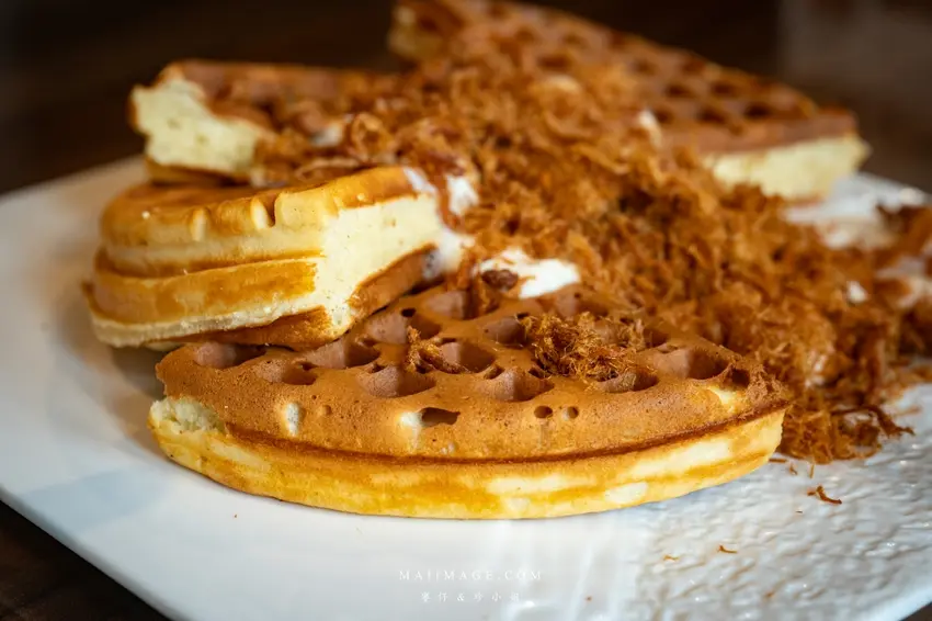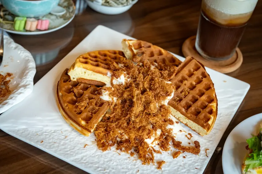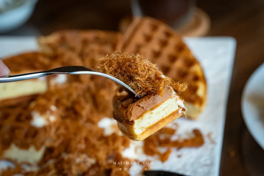 餐點部分首推與在地名店「垂坤食品」跨界合作的特色甜點。苗栗苑裡限定的「苑裡肉鬆巴斯克乳酪」,將香氣濃郁、入口即化的巴斯克乳酪,鋪上滿滿的厚實肉鬆。乳酪的醇厚甜味與肉鬆的鹹香完美契合,鹹甜交織的絕妙滋味令人大為驚豔。另一款高人氣的「苑裡肉鬆鬆餅」,同樣將肉鬆如小山丘般豪邁堆疊,搭配厚度十足、口感扎實的現烤鬆餅一口咬下,豐富的層次保證讓人回味無窮。