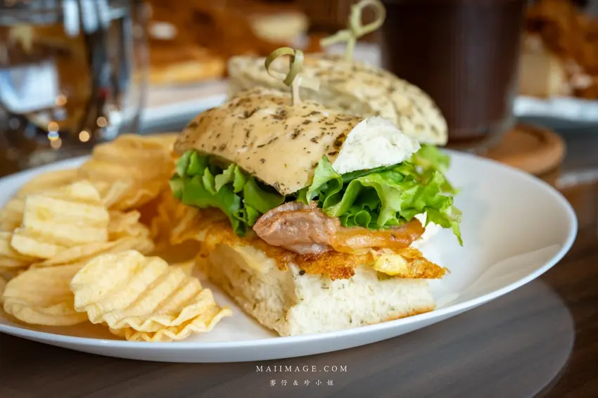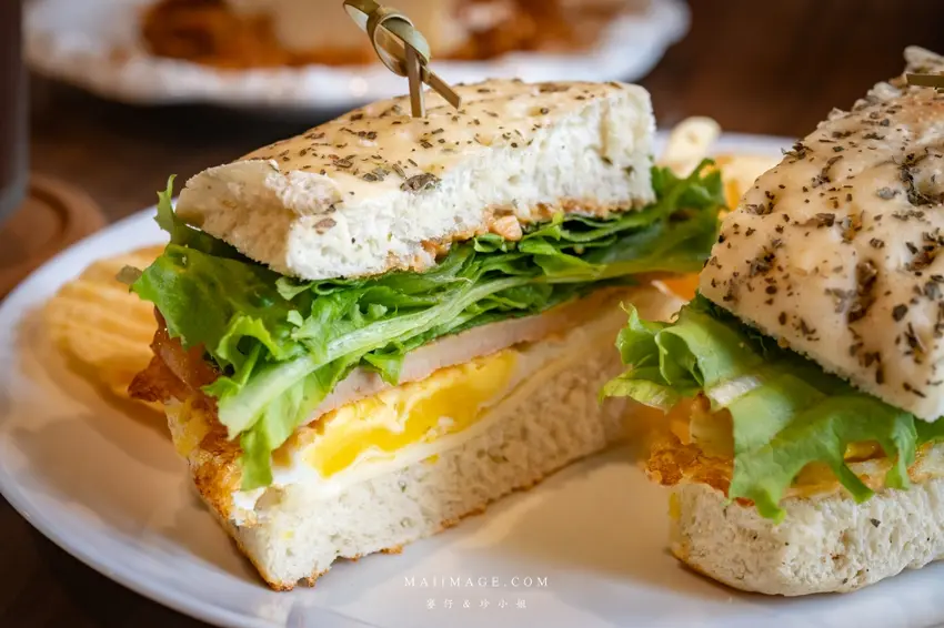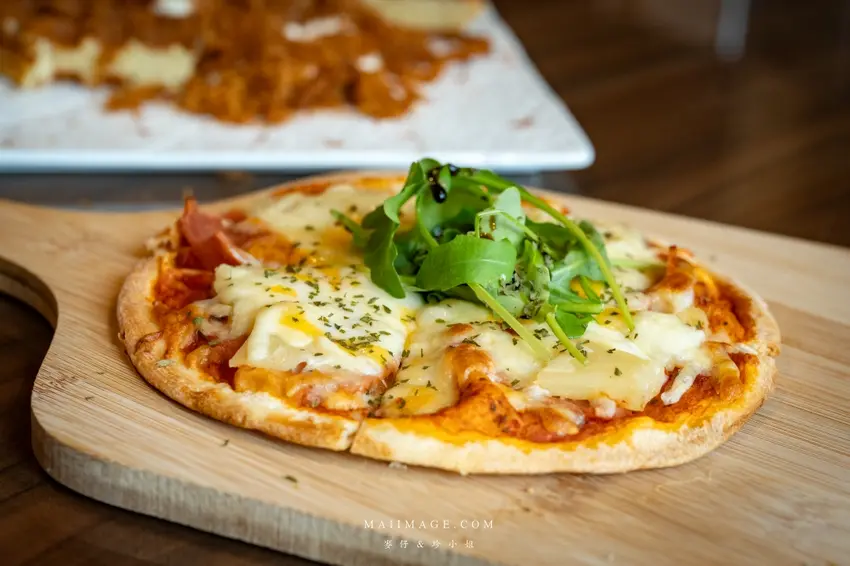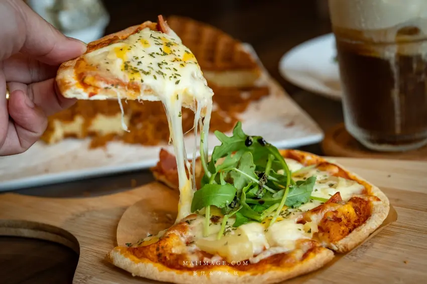 若想品嚐鹹食,份量十足的「花生醬里肌佛卡夏」表現相當亮眼。鬆軟的佛卡夏麵包內夾入厚實的里肌肉片、新鮮生菜與半熟蛋,抹上濃郁的花生醬,鹹香飽滿且極具飽足感,隨餐更附上酥脆薯片,吃飽又吃巧。此外,店內亦提供多種口味的現烤披薩(如經典的瑪格麗特口味),表層鋪滿毫不手軟的濃郁起司,趁熱品嚐時迷人的牽絲效果與醇厚奶香,展現了極高水準的餐飲實力。