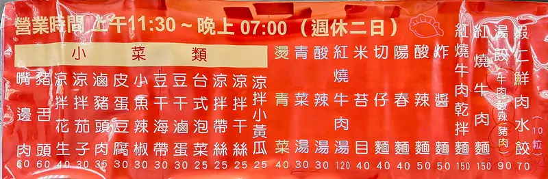 菜單設計極度專精,水餃僅提供單一口味「韭黃蝦仁鮮肉水餃」,通常以 10 顆為單位點餐,一份定價 70 元,平均單顆僅需 7 元。在台北市區,同樣包入完整蝦仁的手工水餃往往要價 10 至 12 元,如此極具競爭力的親民價格實屬難得。除了水餃,店內亦販售定價 40 至 150 元不等的牛肉麵、炸醬麵與米苔目等各式麵食;酸辣湯小碗約 30 元,包含涼拌小黃瓜、嘴邊肉與皮蛋豆腐等十多款小菜更是 20 元起跳。整體而言,只需百元出頭便能享受一頓豐盛飽足的餐點。